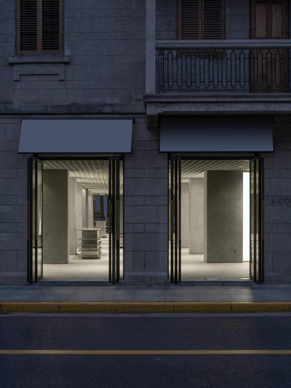 The A-COLD-WALL* Shanghai flagship store, designed by Hesselbrand, embodies the order, rhythm and timeless spatial qualities of monumental architecture, reflecting the brand’s resolute aesthetic. Through eliminating unnecessary decoration, the space is instead characterised by a rhythmic arrangement of stone columns, concealed mirrors and illuminated screen walls…