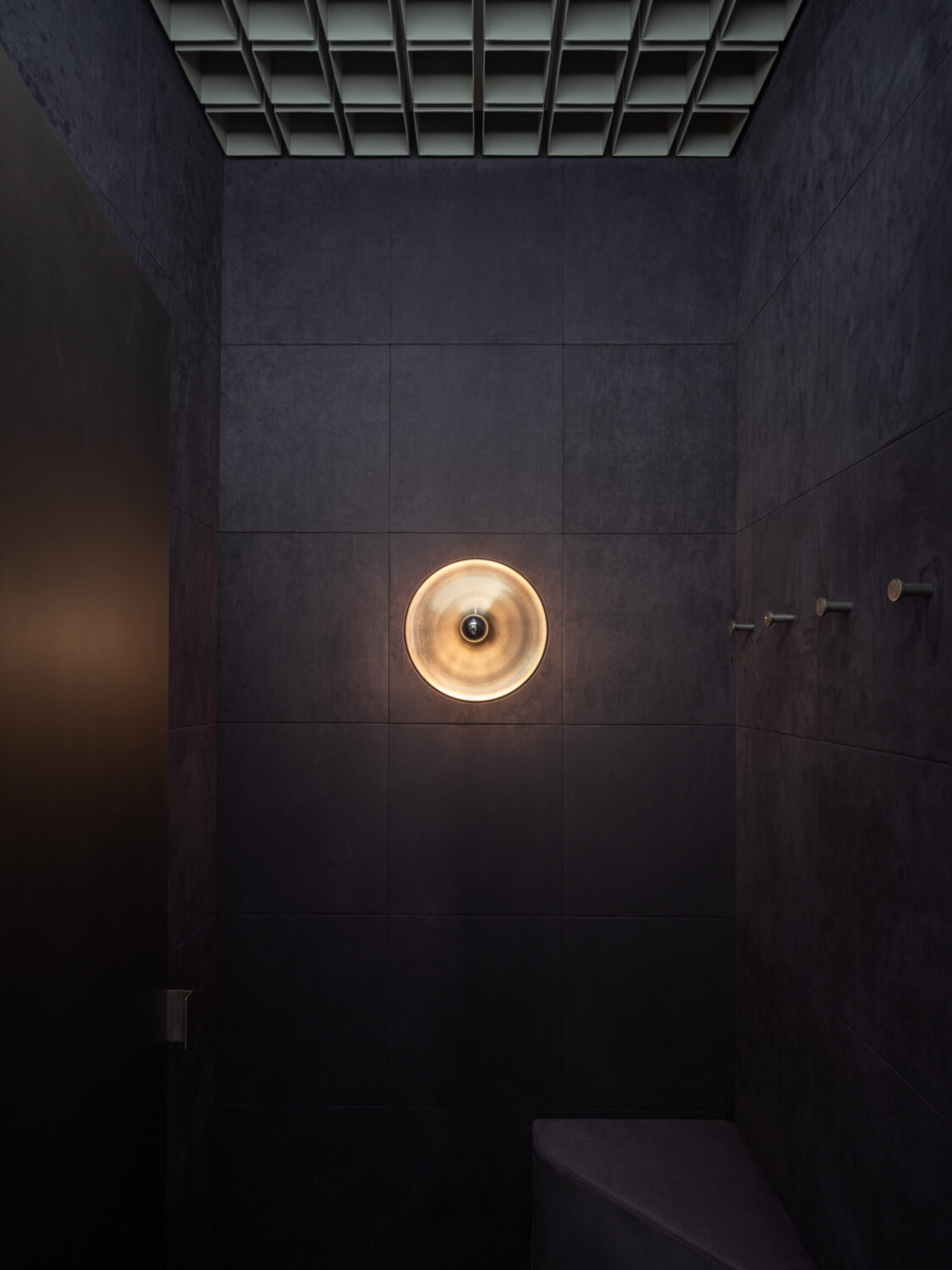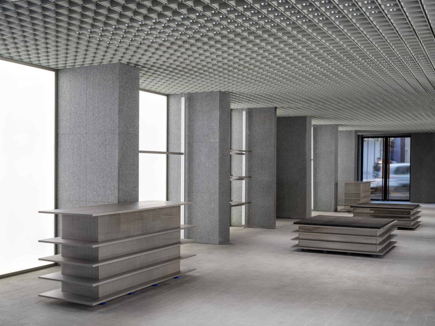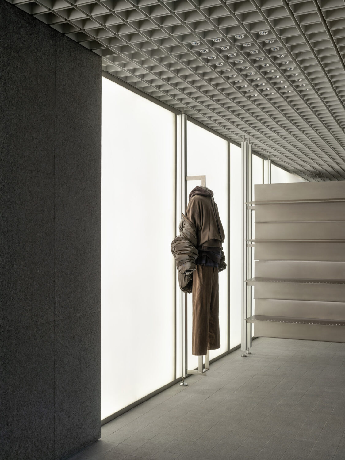 The material palette, including bush-hammered stone, sandblasted glass, brushed aluminium, and woven steel mesh, juxtaposes qualities of permanence and temporality, the natural and industrial. Stone evokes historical weight, while softly illuminated translucent glass lends a sense of ephemerality, crafting an atmosphere that feels both raw and refined. Each material has its own purpose: stone embodies the space with a sense of historical permanence, while the softly illuminated translucent glass introduces an ephemeral & fluid tectonic. The materials come together to create a clear spatial identity for A-COLD-WALL* that feels simultaneously raw, refined and dynamic.