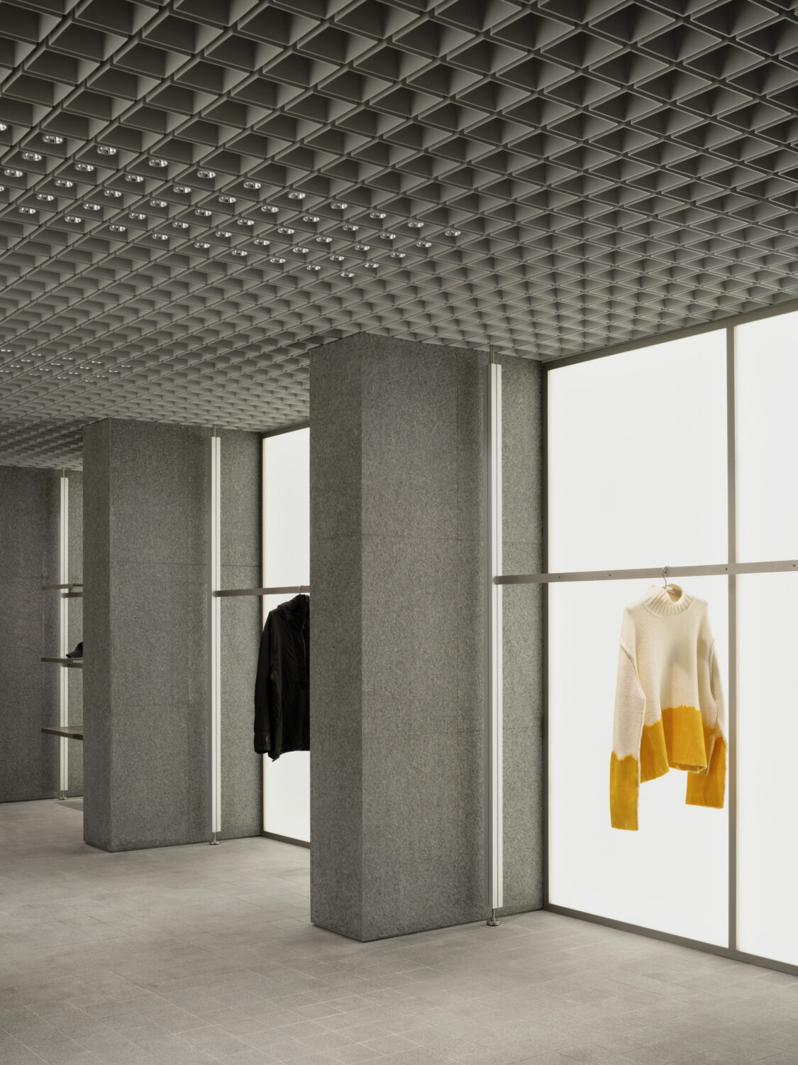 The A-COLD-WALL* Shanghai flagship store, designed by Hesselbrand, embodies the order, rhythm and timeless spatial qualities of monumental architecture, reflecting the brand’s resolute aesthetic. Through eliminating unnecessary decoration, the space is instead characterised by a rhythmic arrangement of stone columns, concealed mirrors and illuminated screen walls.