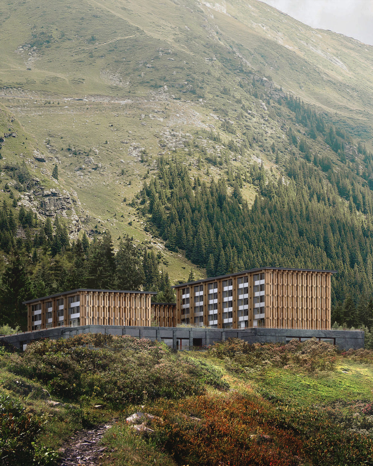 Tradition and high-tech The general layout of the hotel and spa is designed with the specific micro climate of the site in mind. Its orientation makes the most out of the wind and sun conditions, and all parts of the building have been considered as potentials for contributing to the sustainability of the development. The large rectangular roofs are covered with plants and solar panels, and to reduce the environmental impact of shipping and storing, all stone used in the design comes from local quarries. Tall and robust timber columns stretch all the way from the ground to the top floors, with a forest-like density on the short sides of the building. The CLT (cross laminated timber) construction is a significantly more sustainable option compared to more traditional construction methods. The latest innovation and technology is used to create a cutting edge structural design, using local materials that are central to traditional Swiss buildings.