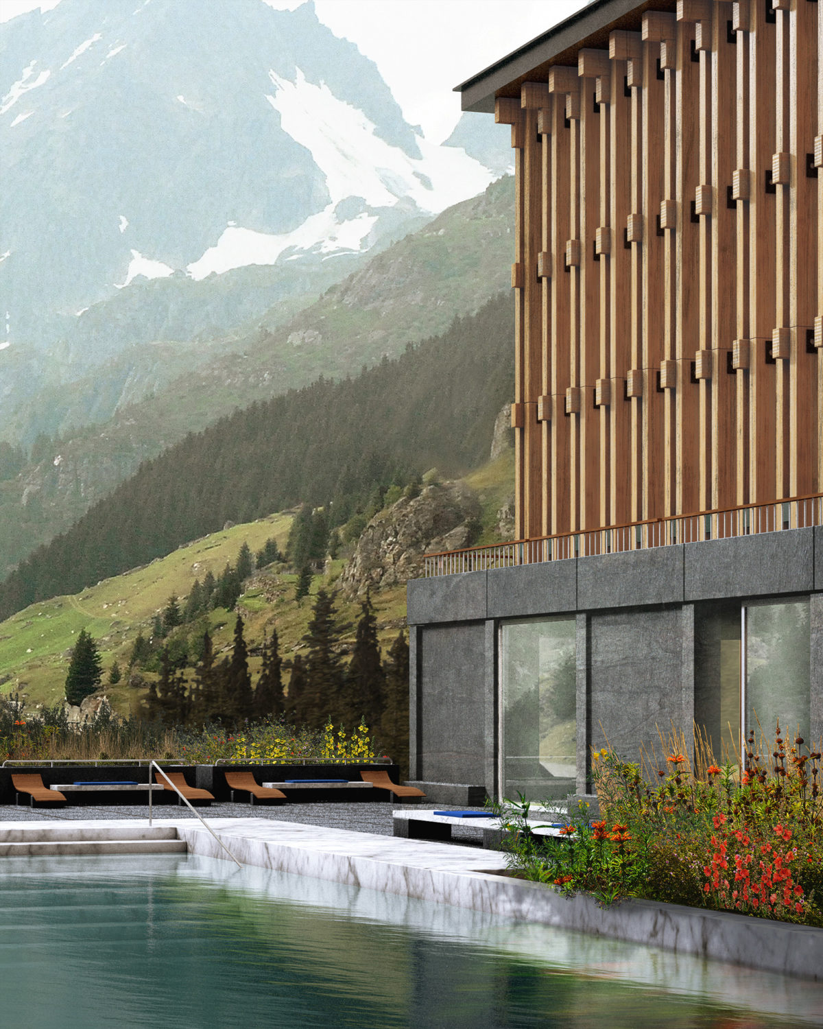 A grounded experience Acquarossa Spa & Hotel is designed to provide an authentic experience of alpine life in one of the most remote parts of Switzerland where tourism is still budding. Echoing the language of the traditional rustici houses found in the local area, the design of the hotel is characterised by three expressive timber structures carefully placed on a stone plinth. The combination of natural and man-made materials gives the hotel a classical yet contemporary image, bridging modern architecture with the traditional buildings of the Swiss Alps. The hotel and its surroundings have been designed as a place to feel grounded, where the thermal spring and mountains offer a range of experiences throughout all seasons of the year.
