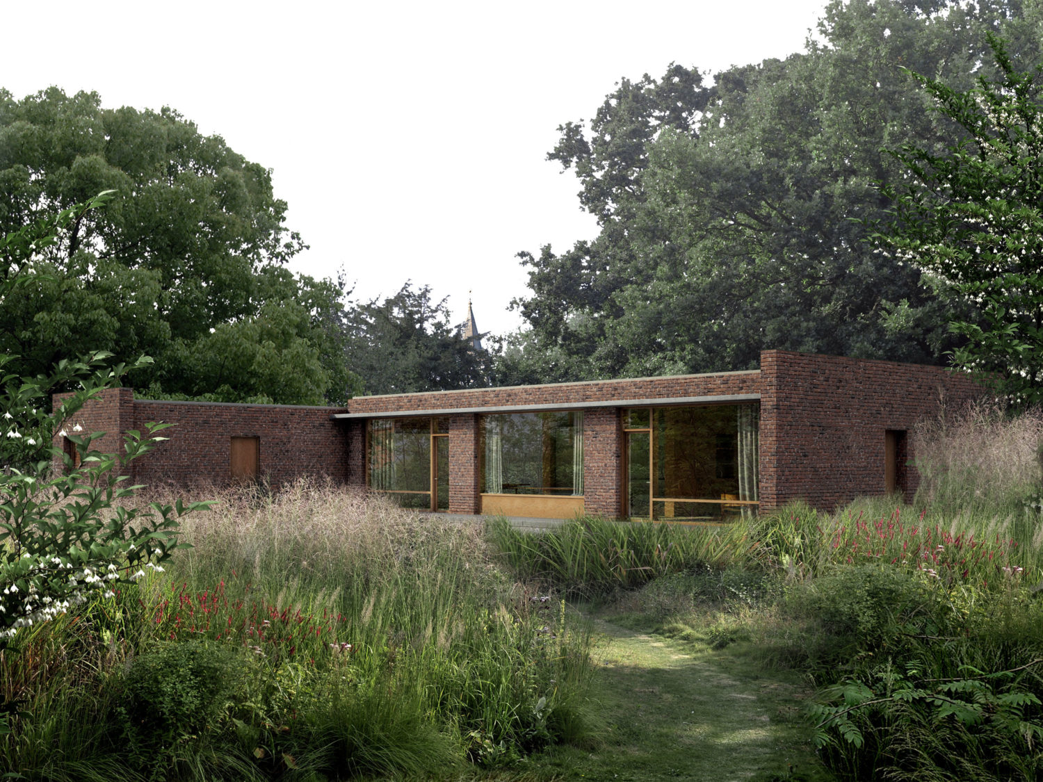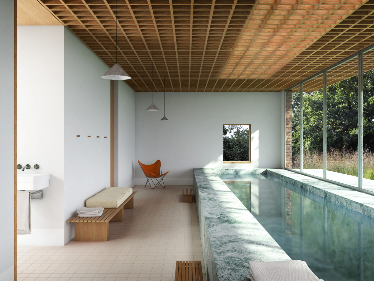 An indoor swimming pool stretches along the western side of the house, with a full panoramic view of the garden outside. The volume of the swimming pool building frames the courtyard outside in front of the building and divides the garden diagonally into two areas: the private north and west sides, and the social south and east sides.