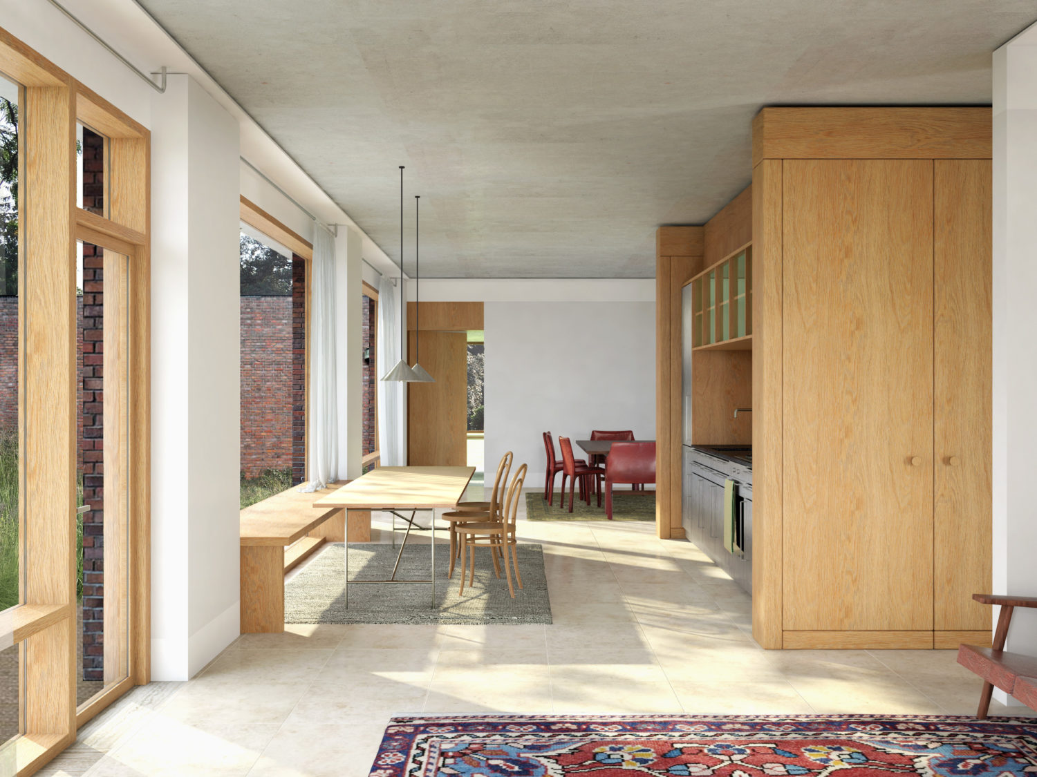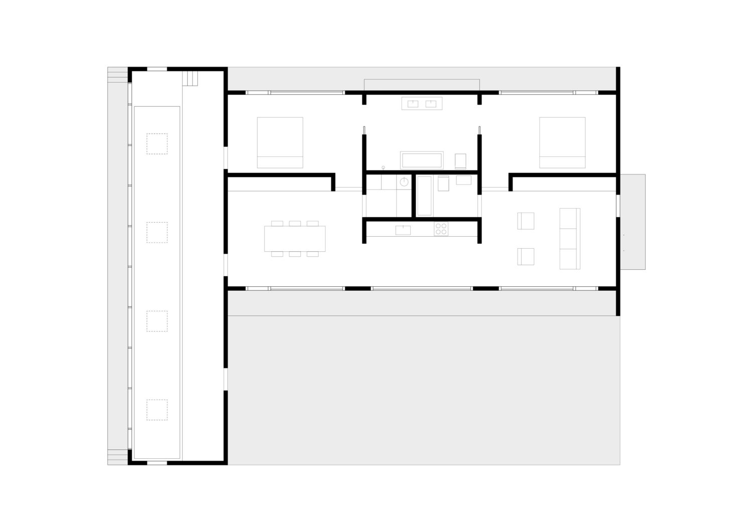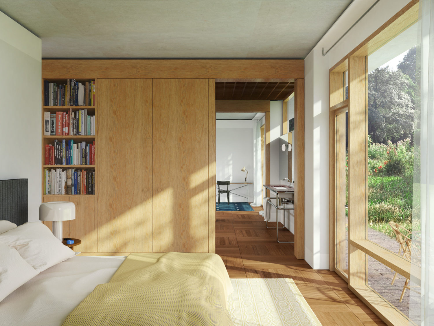 The two living rooms flank the central kitchen on one side of the central core, making it possible to connect all three rooms into one large space. An external terrace runs all along the three space on the south side of the building, extending the interior into the garden. On the opposite side of the building, two large personal spaces are connected via a double entrance bathroom. This makes it possible to use the spaces both as bedrooms and studies, or a combination of the two due to the generous dimensions. Both personal rooms have small, north facing terraces outside.