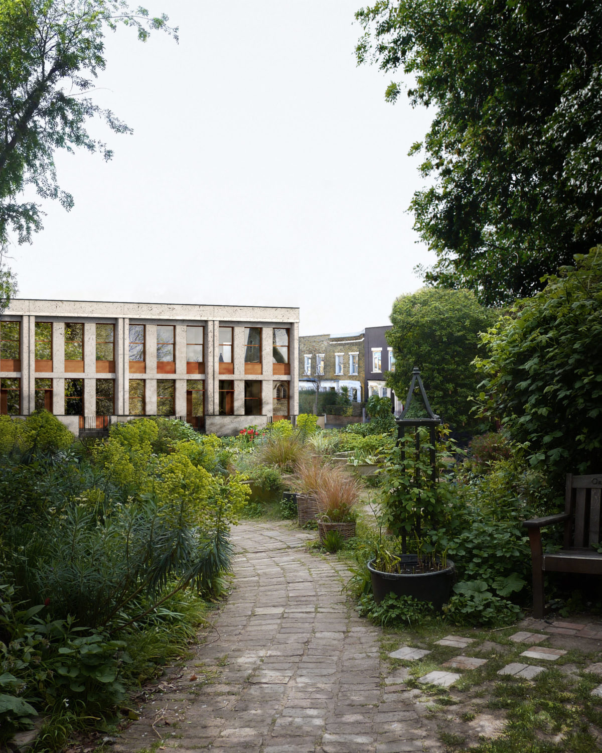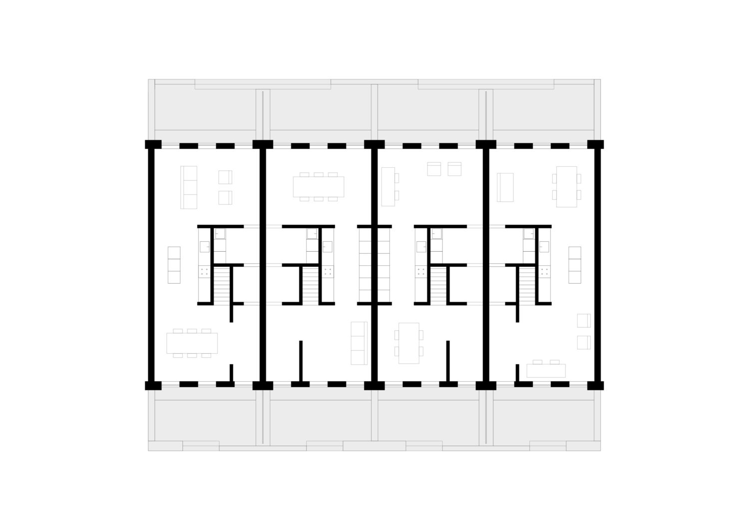 On the first floor the staircase lands in a third living room which connects to the bathroom and bedrooms. This is a more private space, but large enough for social use. A large skylight above can be opened for natural ventilation to cool the whole house. Depending on the number of bedrooms required, this third living room can be extended either towards the rear or the front façade to provide a view towards the street or the garden. Ultimately this plan layout makes the house open ended and equally suited for a single family, a flat share, a live and work situation or multi-generational living.