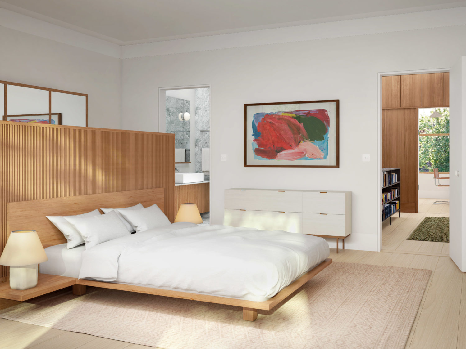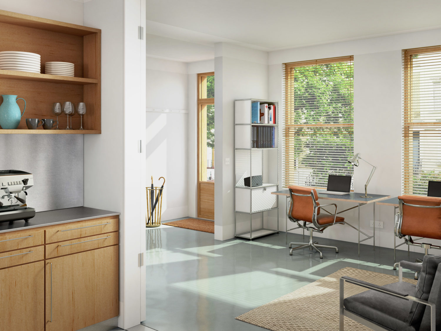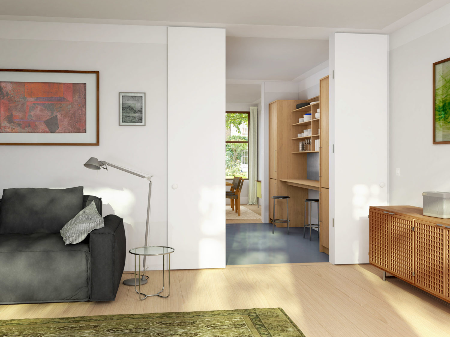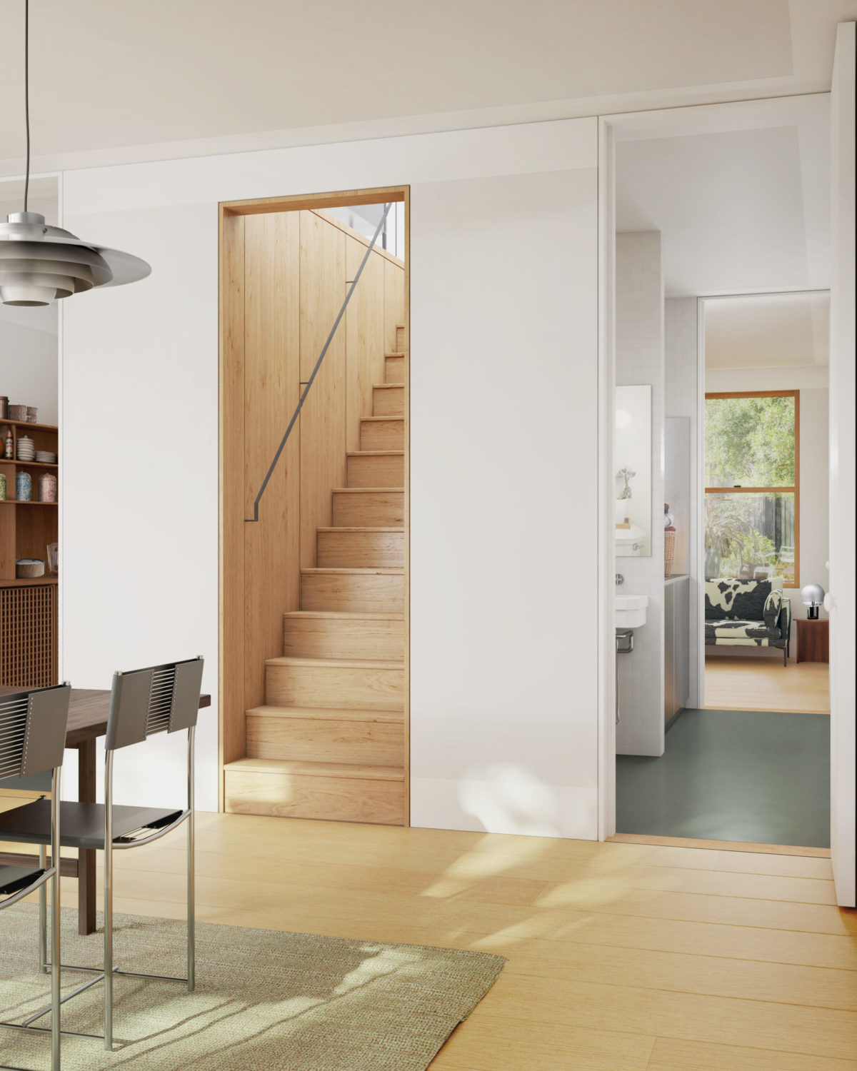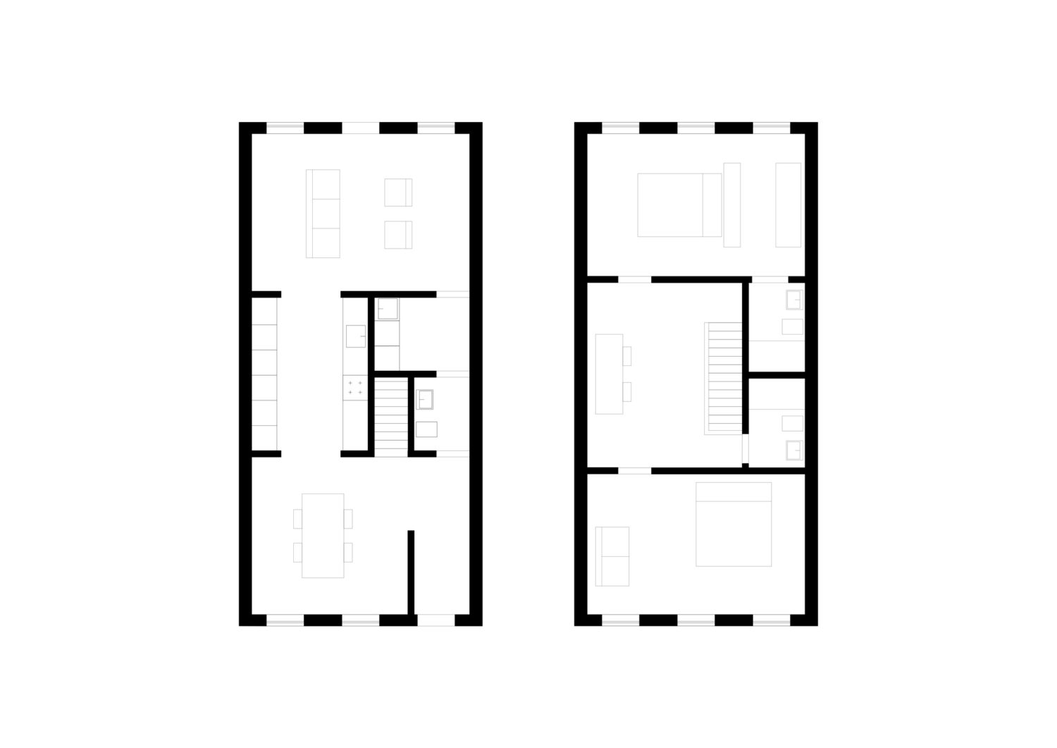 The ground floor is divided into a semi-public space towards the front, and a more private space at the rear. Upon entering the house you have the option to go straight through to the rear living room via the core, or to enter into the front living room. This dual access makes it possible to dedicate the front living room to a small office, or similar semi-public function. The front living room connects to the kitchen on the other side of the core, so that it can be accessed both by the front living room and the more private spaces.