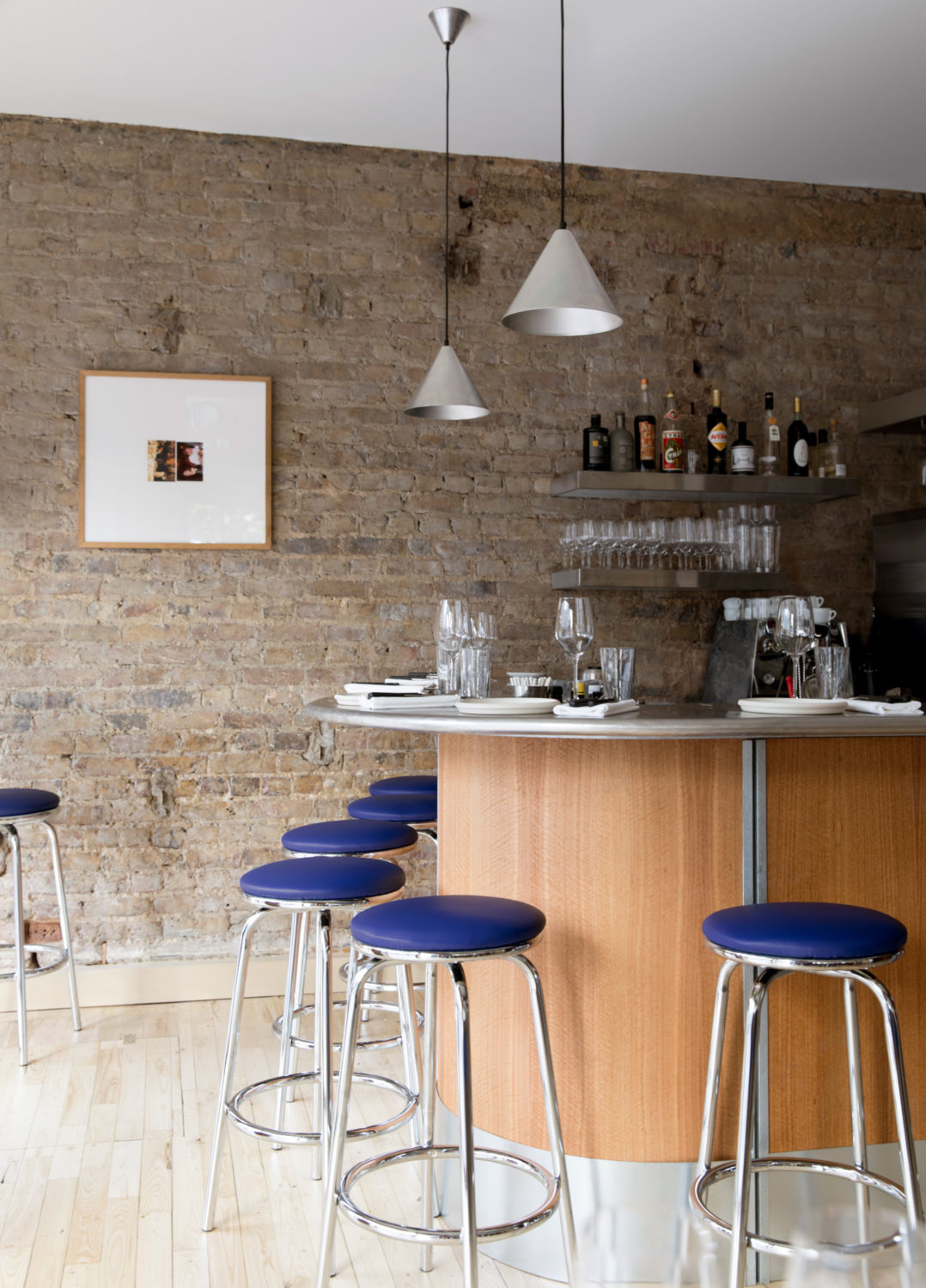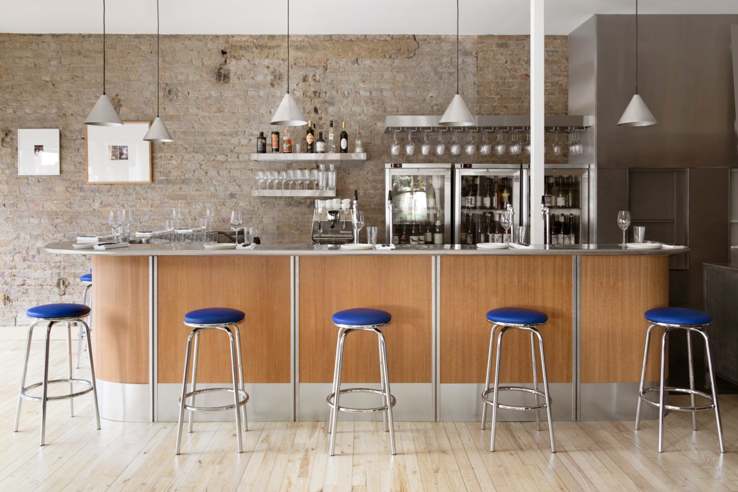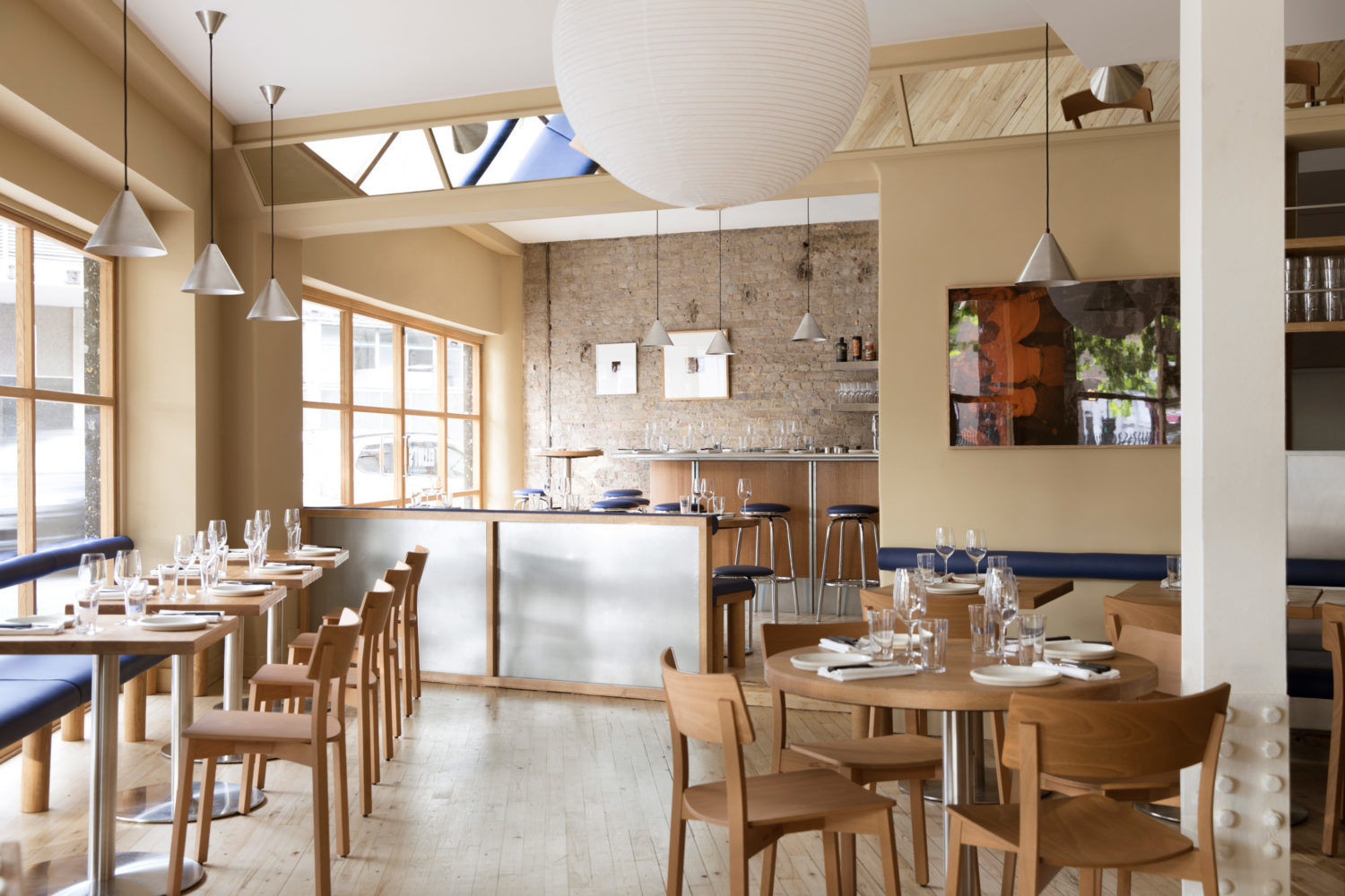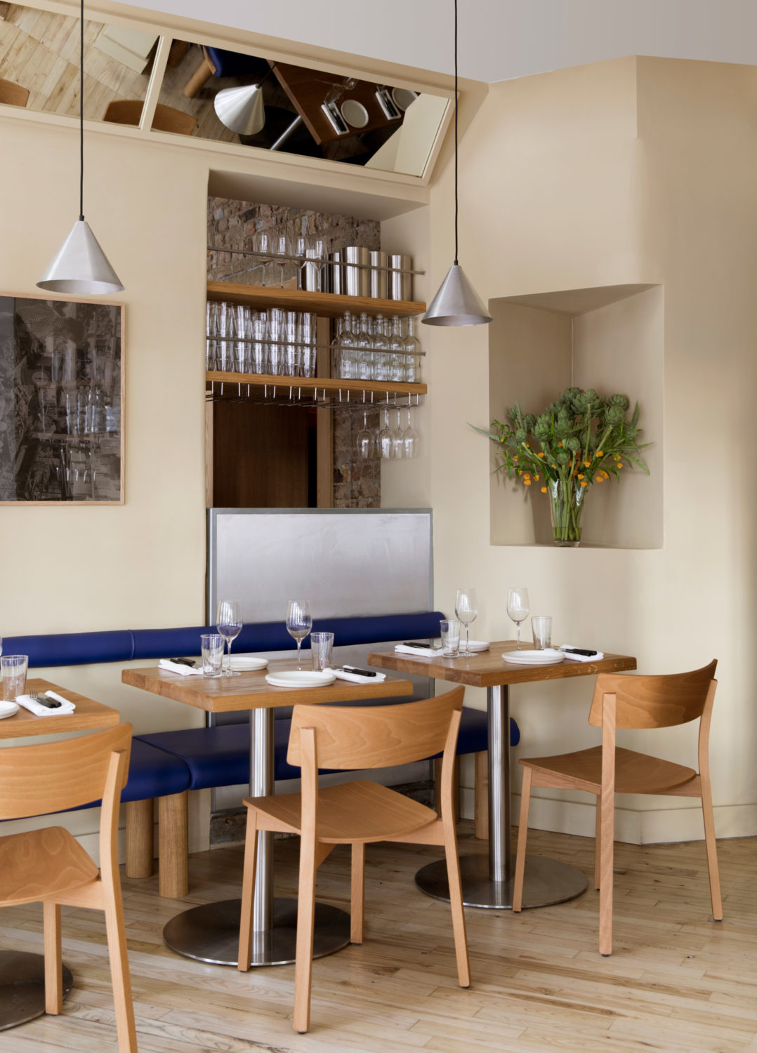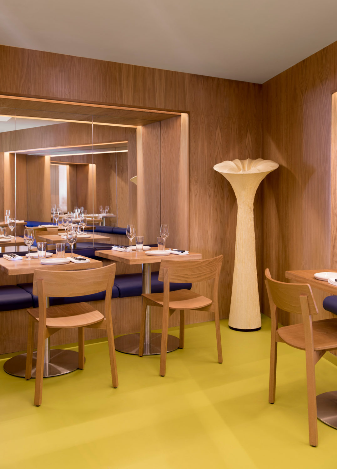 As you enter the restaurant through the oversized glass door, you are greeted by a generous, curved bar made of sustainably sourced eucalyptus wood and brushed stainless steel. The front dining room is flooded with daylight and overlooks a junction that gets busy with pedestrians on weekend nights. The banquets that line the walls and shop front are designed as robust wooden benches with a cobalt blue leather pad on the seat. The bolster backrests are thin and tube-like, allowing as much natural light as possible to pass in through the windows. In contrast to the main dining area there is an intimate, dimly lit dining room to the rear of the restaurant. This space has a contemporary and festive atmosphere, with oak panel walls all around, large mirrors, and a citrus coloured floor.