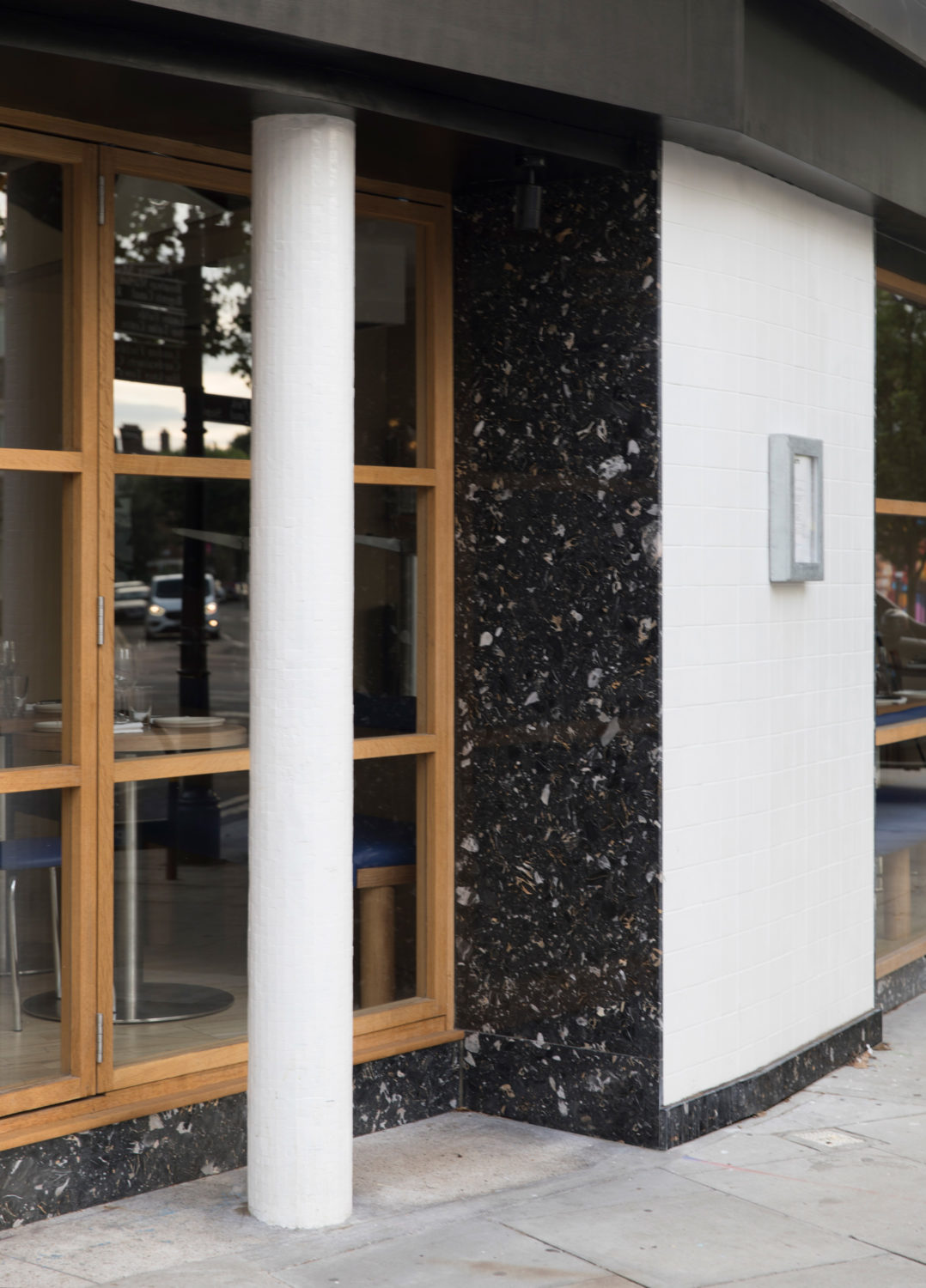 On the exterior, the existing 1950’s brick building has a new facade in ceramic tiles and terrazzo slabs, with massive orange awnings over the large shop front windows. The windows and bifolding doors are made from custom solid oak frames, which makes the exterior and interior seamlessly blend together as one coherent design. This creates a strong connection between the main dining room and the outdoor seating area on the lively corner on Mare Street, making the most of the unique location in the heart of Hackney.