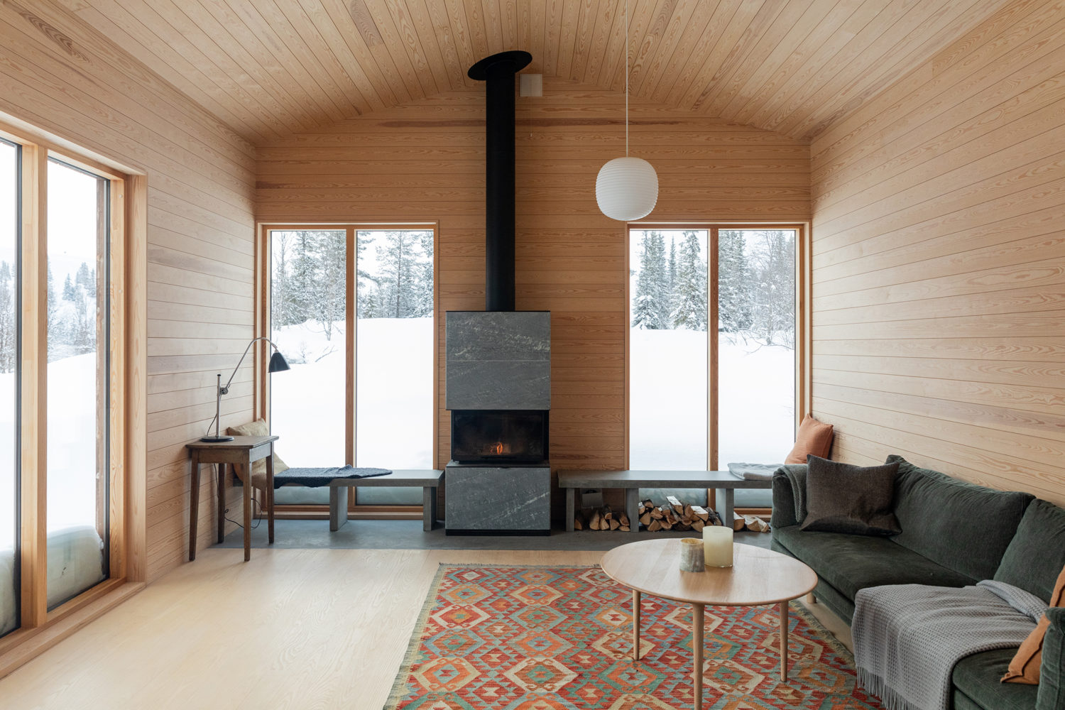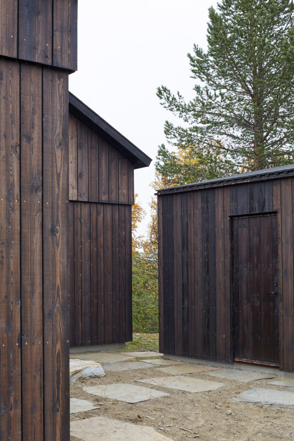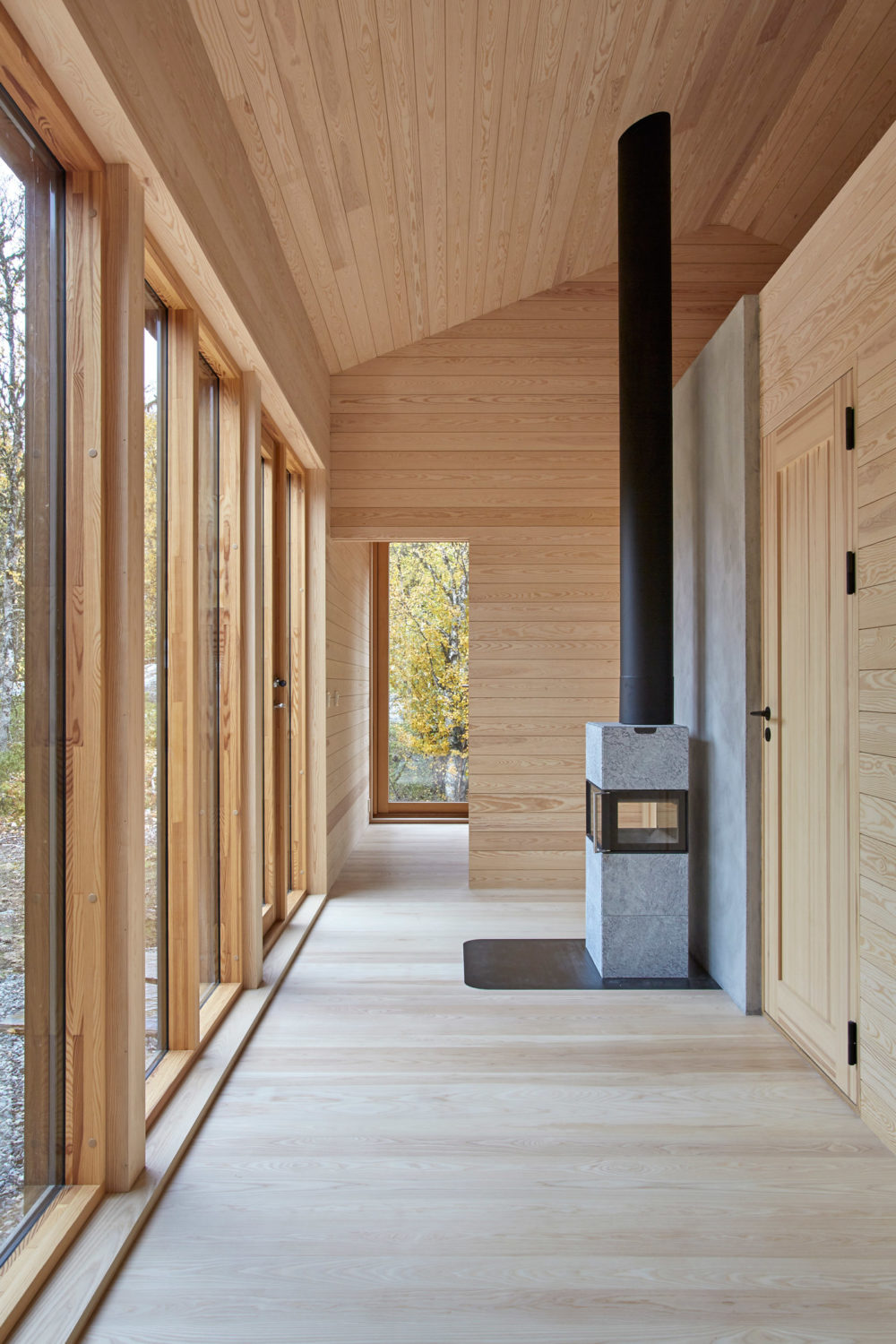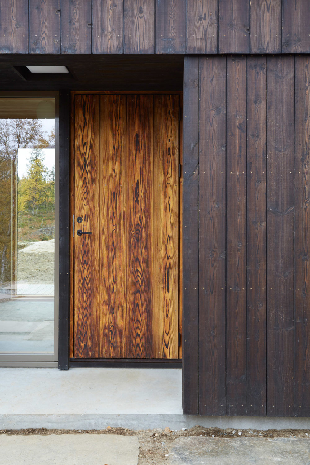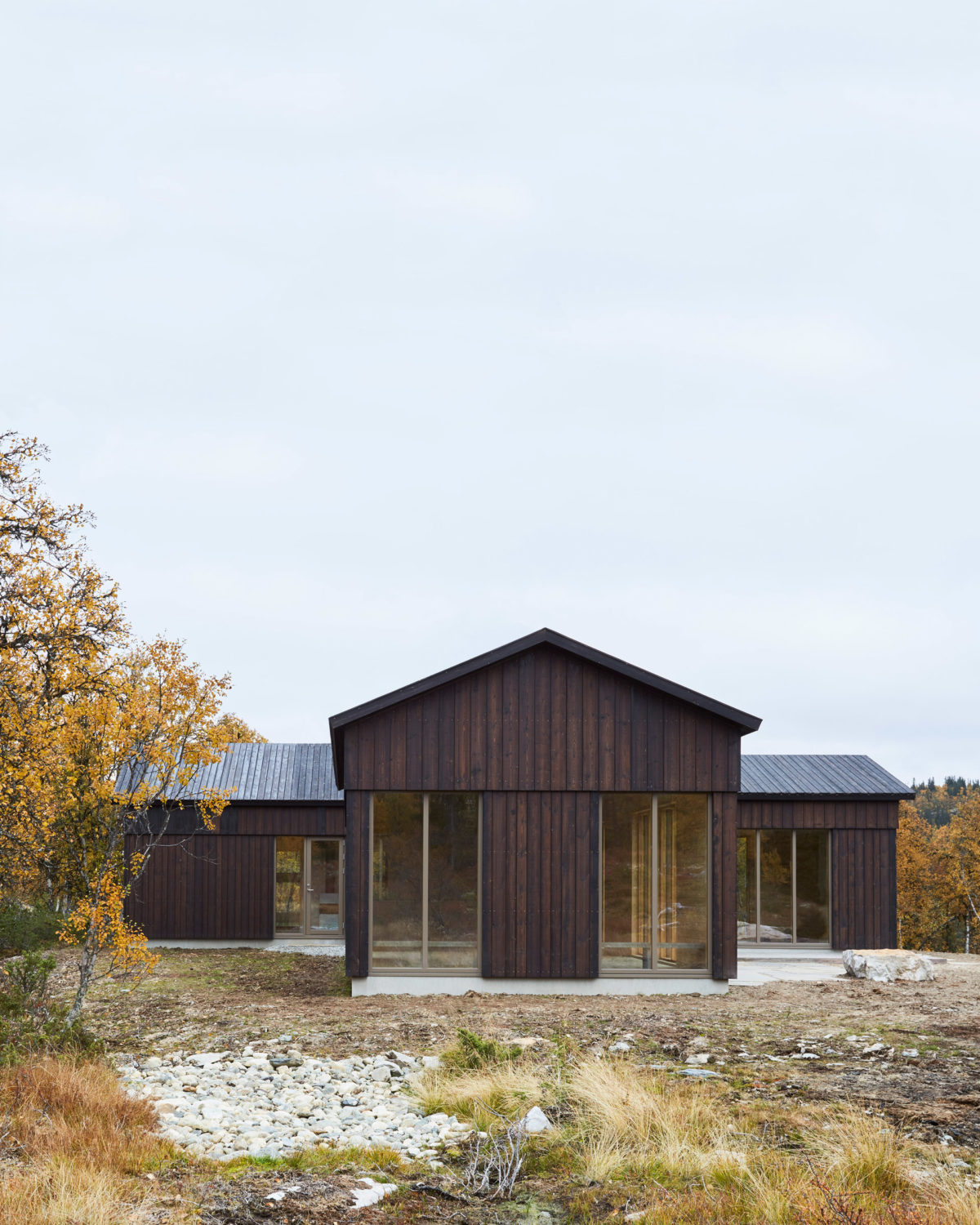 The house is constructed by prefabricated and pre-cut structural timber elements. The exterior walls are clad in a charred, brushed and oiled ore-pine, similar to traditional Norwegian stave churches. This ancient method of charring the facade provides naturally sustainable weather protection for the timber. The interior walls are clad in a contrasting light oiled pine, and the floors are finished in ash and concrete. The various types of fixed furniture (i.e. kitchen, beds and storage units) are built in grey lacquered MDF and birch plywood. The precise detailing gives the building a contemporary expression whilst the use of timber cladding on both exterior and interior, in combination with the large gable roofs, creates a connection to timeless regional building traditions.