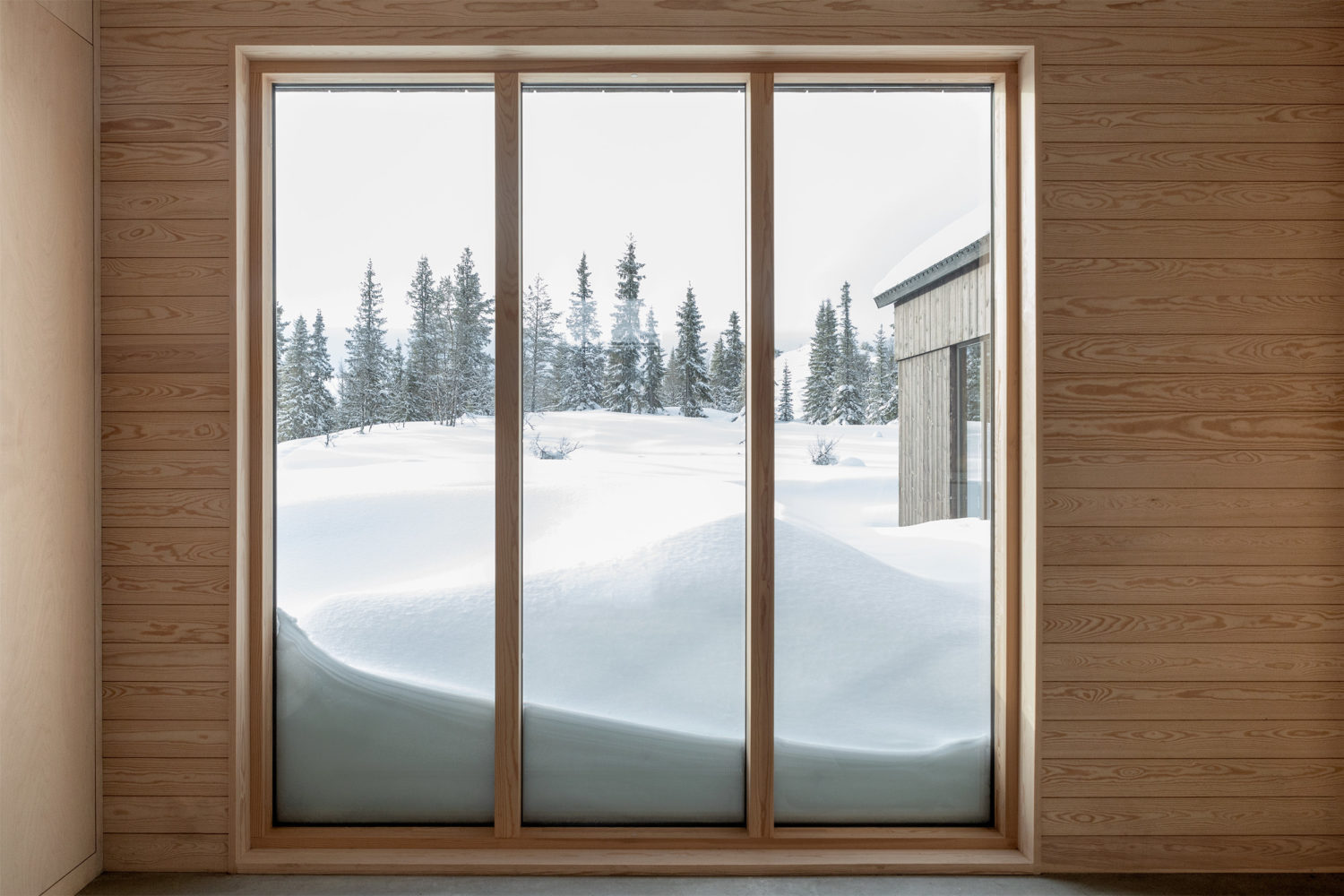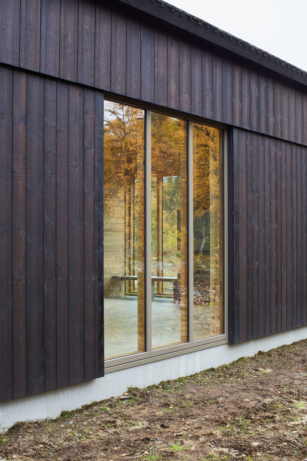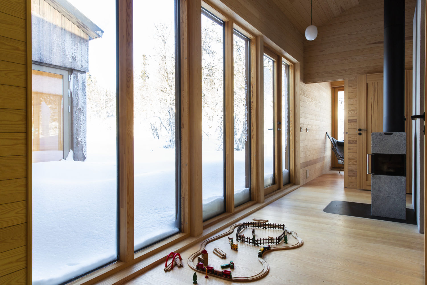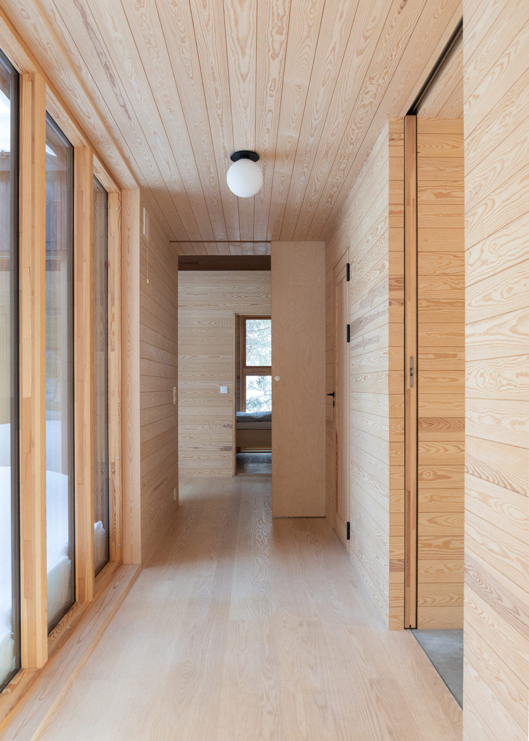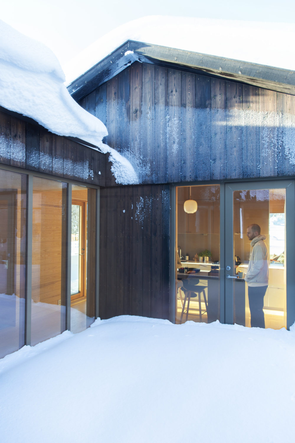 The house is constructed by prefabricated and pre-cut structural timber elements. The exterior walls are clad in a charred, brushed and oiled ore-pine, similar to traditional Norwegian stave churches. This ancient method of charring the facade provides naturally sustainable weather protection for the timber. The interior walls are clad in a contrasting light oiled pine, and the floors are finished in ash and concrete. The various types of fixed furniture (i.e. kitchen, beds and storage units) are built in grey lacquered MDF and birch plywood. The precise detailing gives the building a contemporary expression whilst the use of timber cladding on both exterior and interior, in combination with the large gable roofs, creates a connection to timeless regional building traditions.