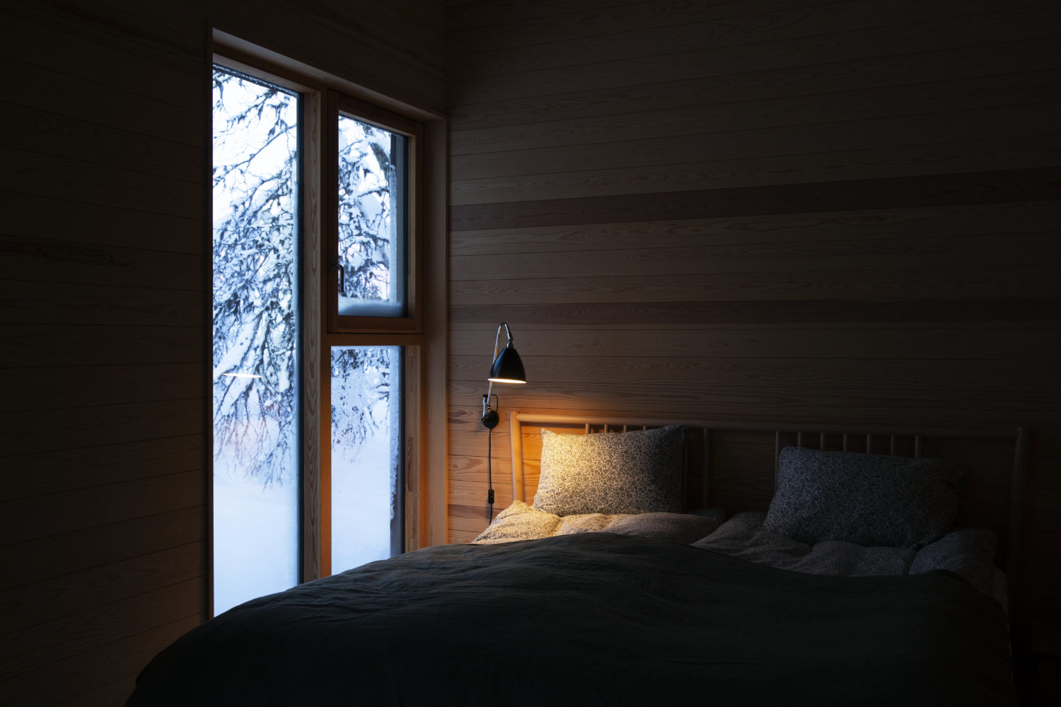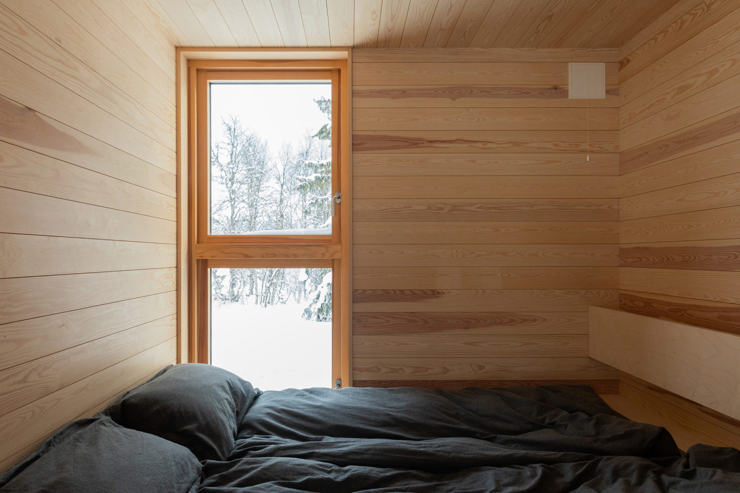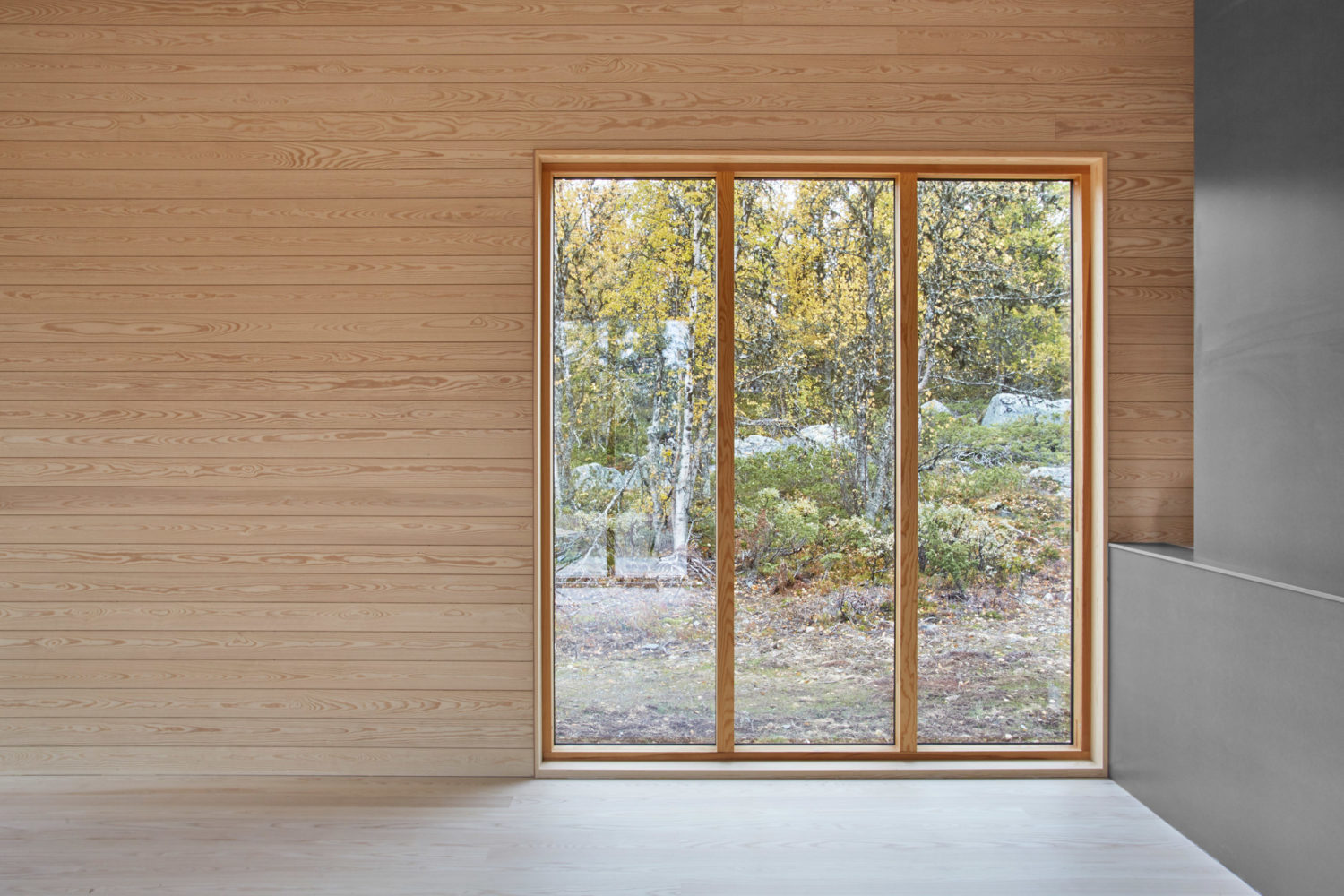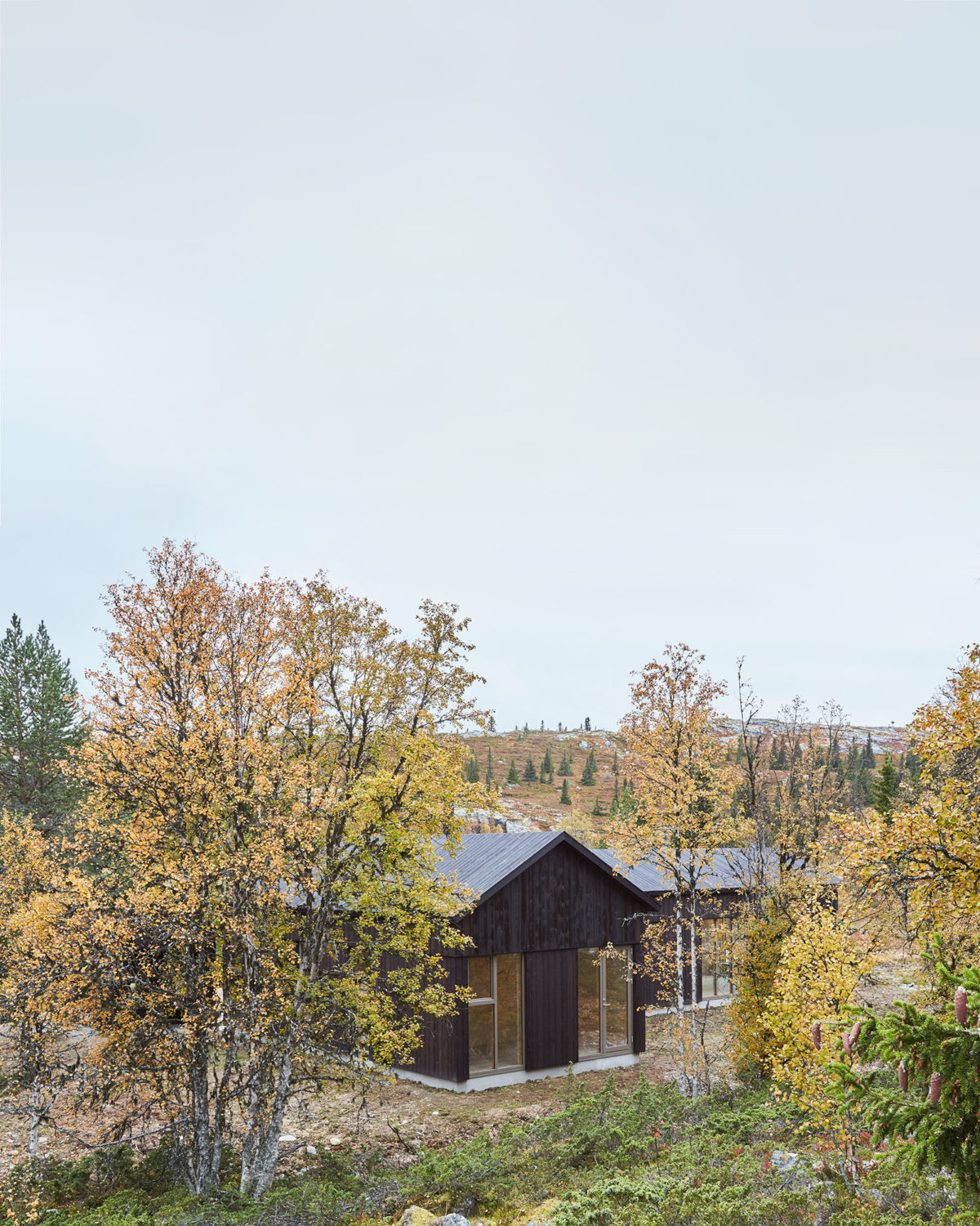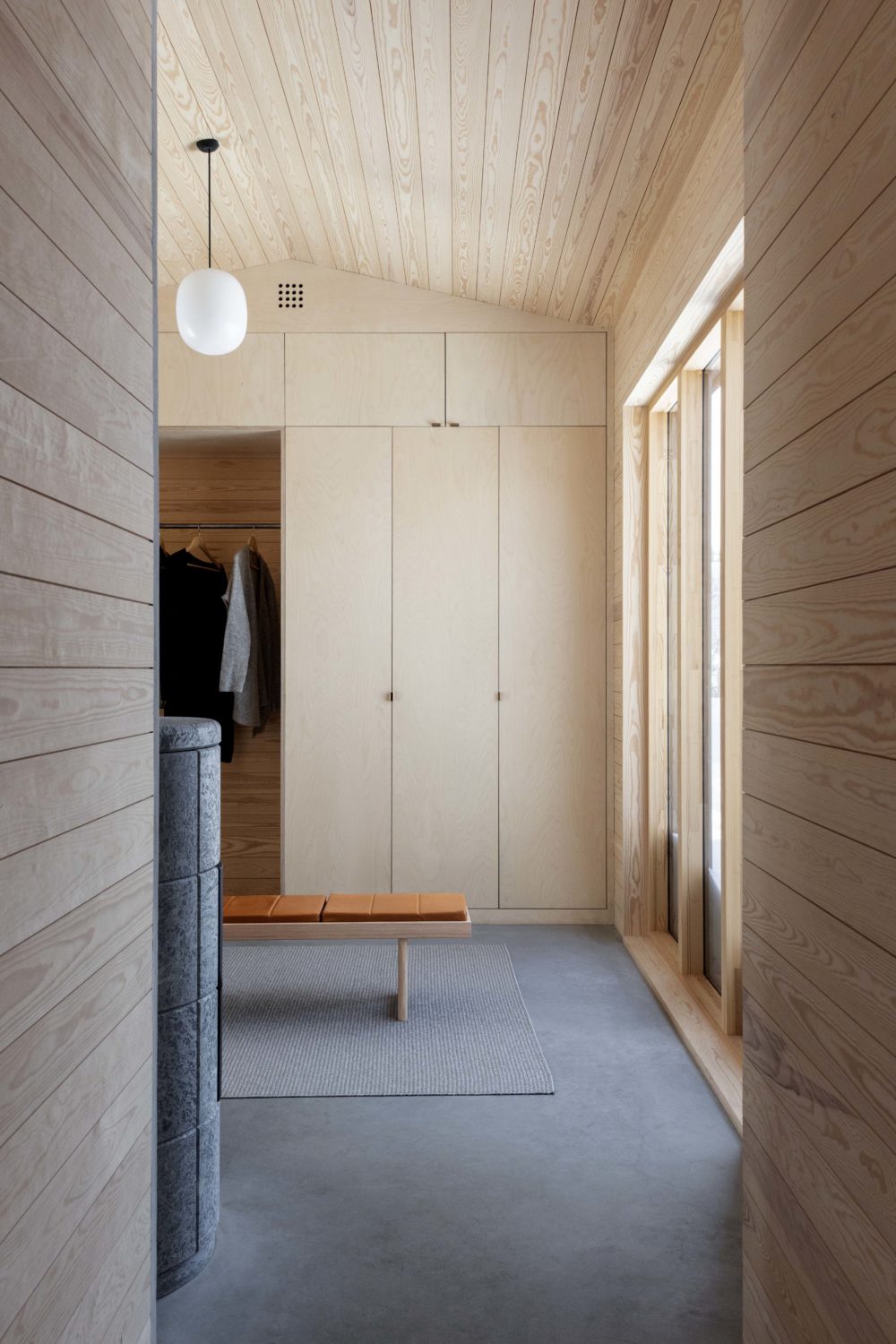 The house is constructed by prefabricated and pre-cut structural timber elements. The exterior walls are clad in a charred, brushed and oiled ore-pine, similar to traditional Norwegian stave churches. This ancient method of charring the facade provides naturally sustainable weather protection for the timber. The interior walls are clad in a contrasting light oiled pine, and the floors are finished in ash and concrete. The various types of fixed furniture (i.e. kitchen, beds and storage units) are built in grey lacquered MDF and birch plywood. The precise detailing gives the building a contemporary expression whilst the use of timber cladding on both exterior and interior, in combination with the large gable roofs, creates a connection to timeless regional building traditions.