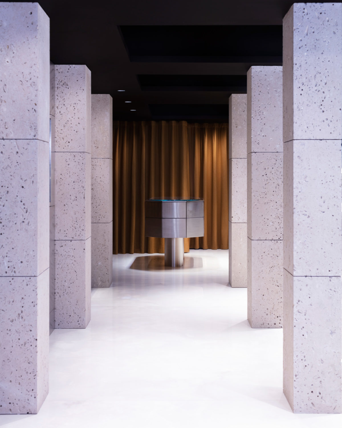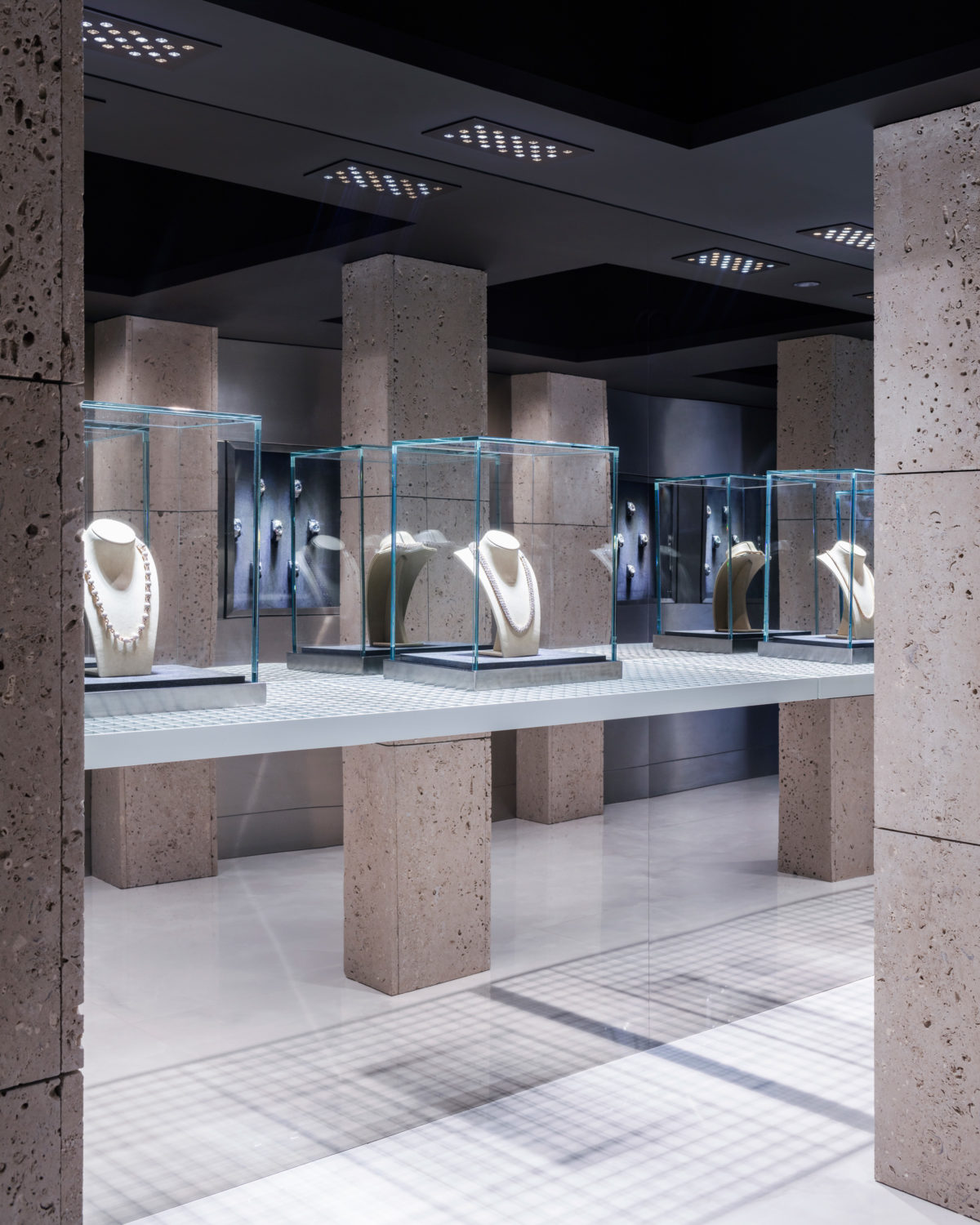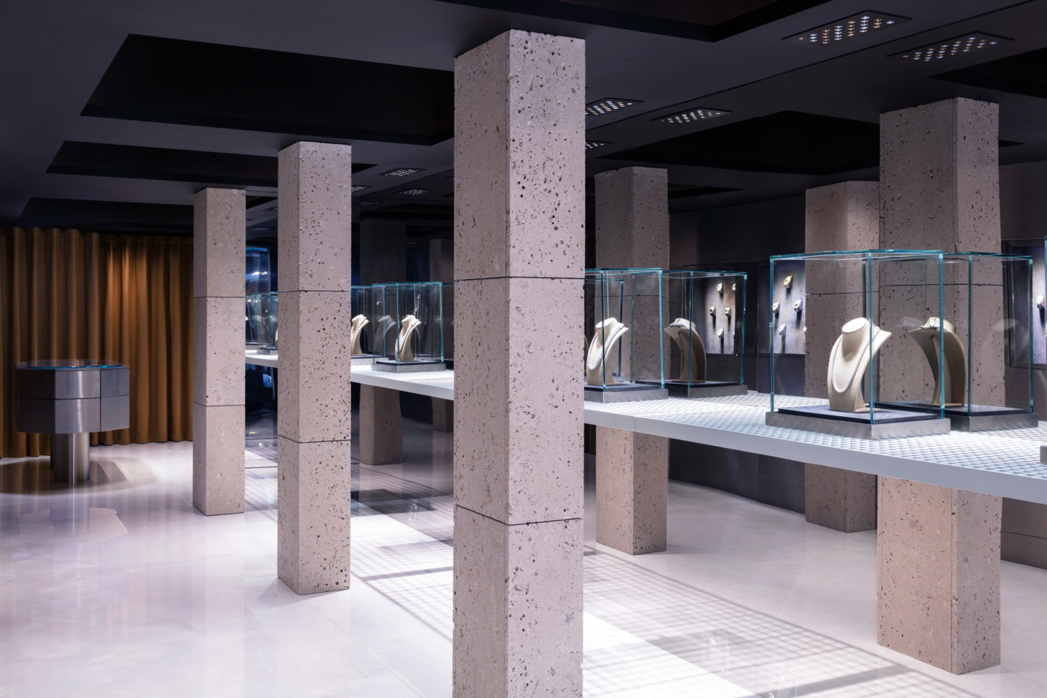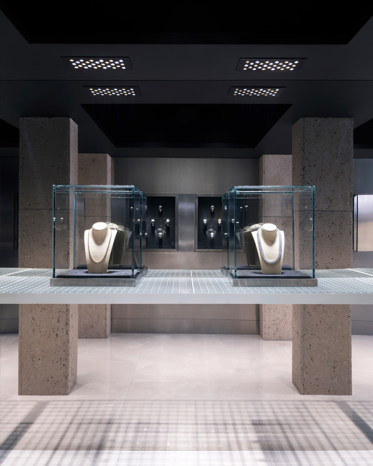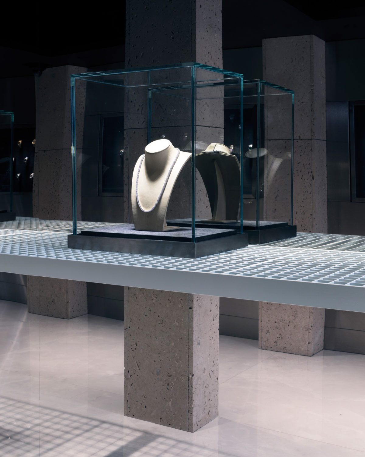 The shop front is made of translucent sheets of soft mint acrylic, which obscures the inside, allowing customers only a glimpse of the movement and light inside. In the Gallery, only a few watches and jewellery pieces are displayed, creating a sense of exclusivity. Visitors are free to roam this area, without being asked questions, breaking down the barrier between customer and exclusive pieces. The gallery features a floating shelf on a mirrored wall, where the stone columns are reflected, creating a sense of space that is twice as big as it actually is.