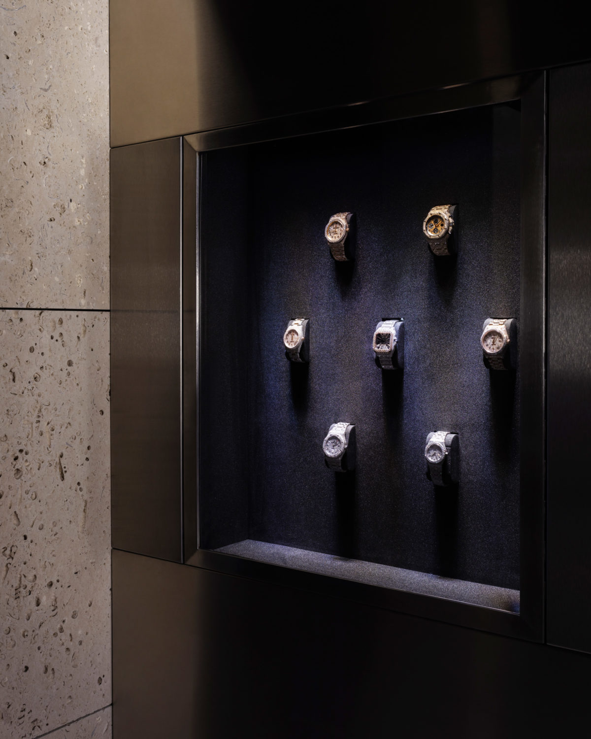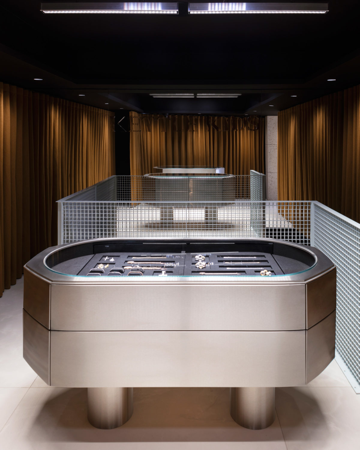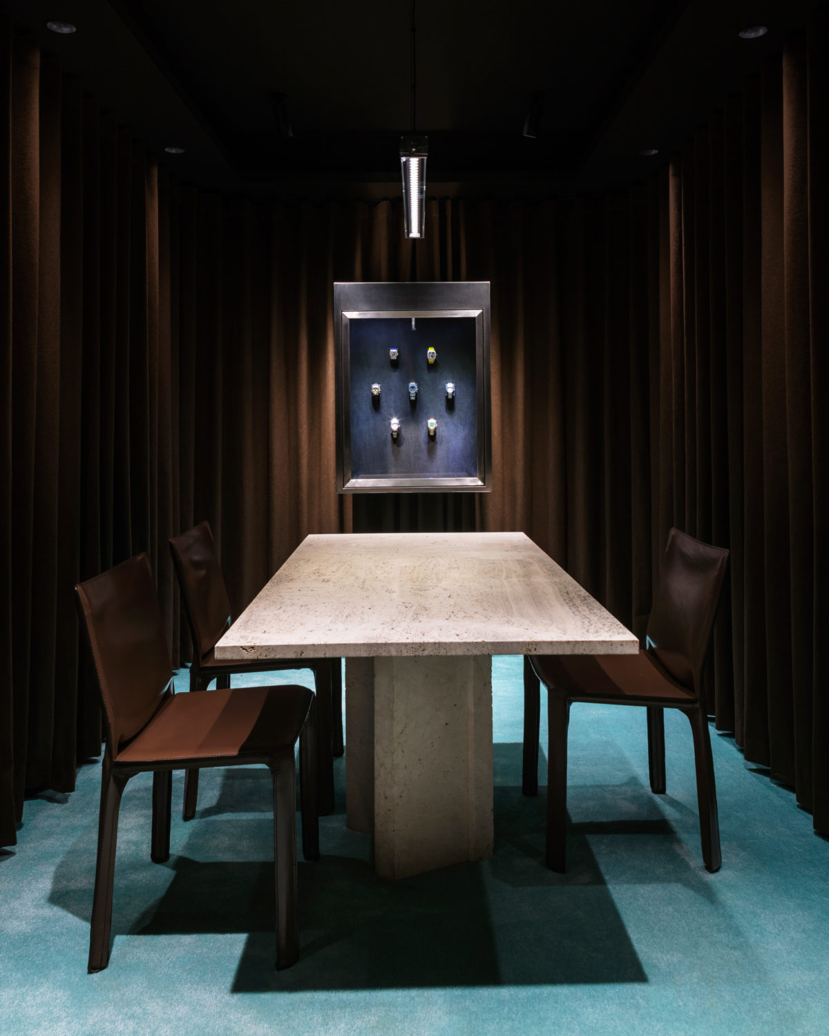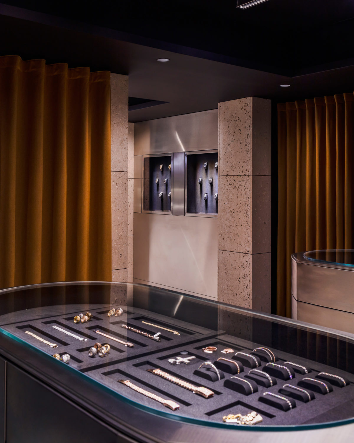 In the Viewing Room, customers are greeted by the sales staff, surrounded by two massive, custom-made stainless steel display cabinets filled with watches and jewellery. This room is surrounded on all walls by camel wool curtains. Beyond the curtains is the Rear Room, a private sales room wrapped in soft fabric, where the most exclusive and rare watches are kept, and customers can sit down at massive stone table.The VIP lounge is located in the basement, featuring a conversation pit made with thick pile luxurious carpet and tangerine velvet upholstery, where customers can view the rarest watches and custom diamond pendants.