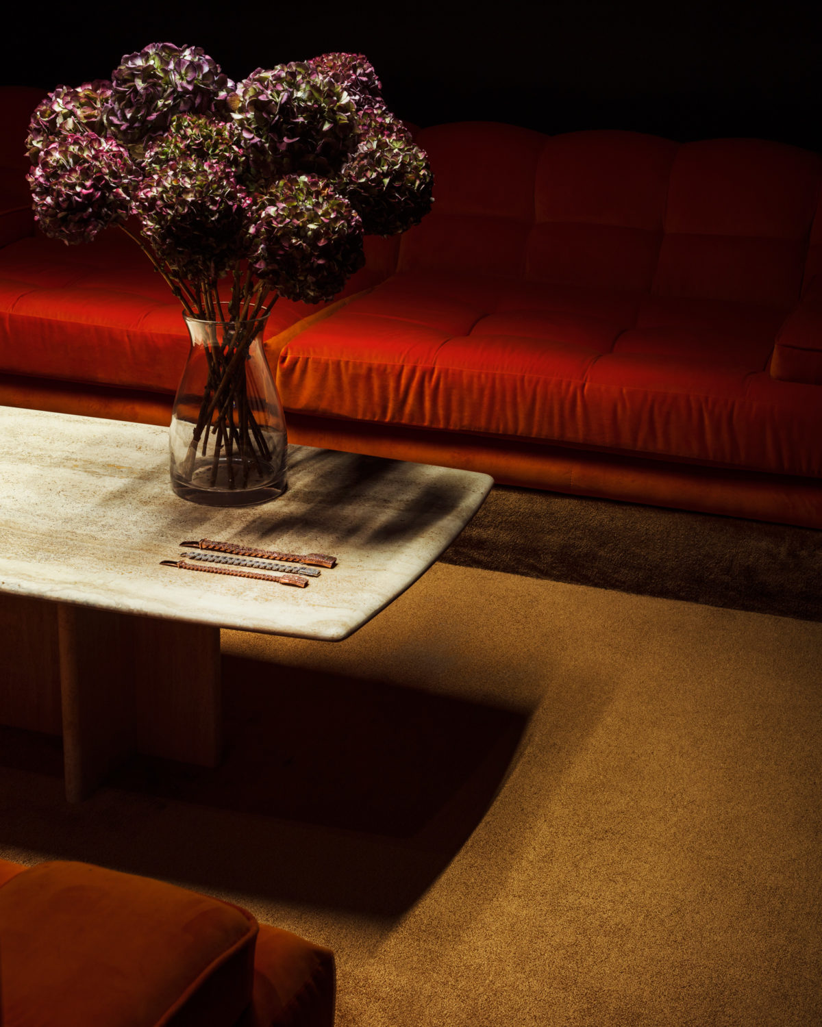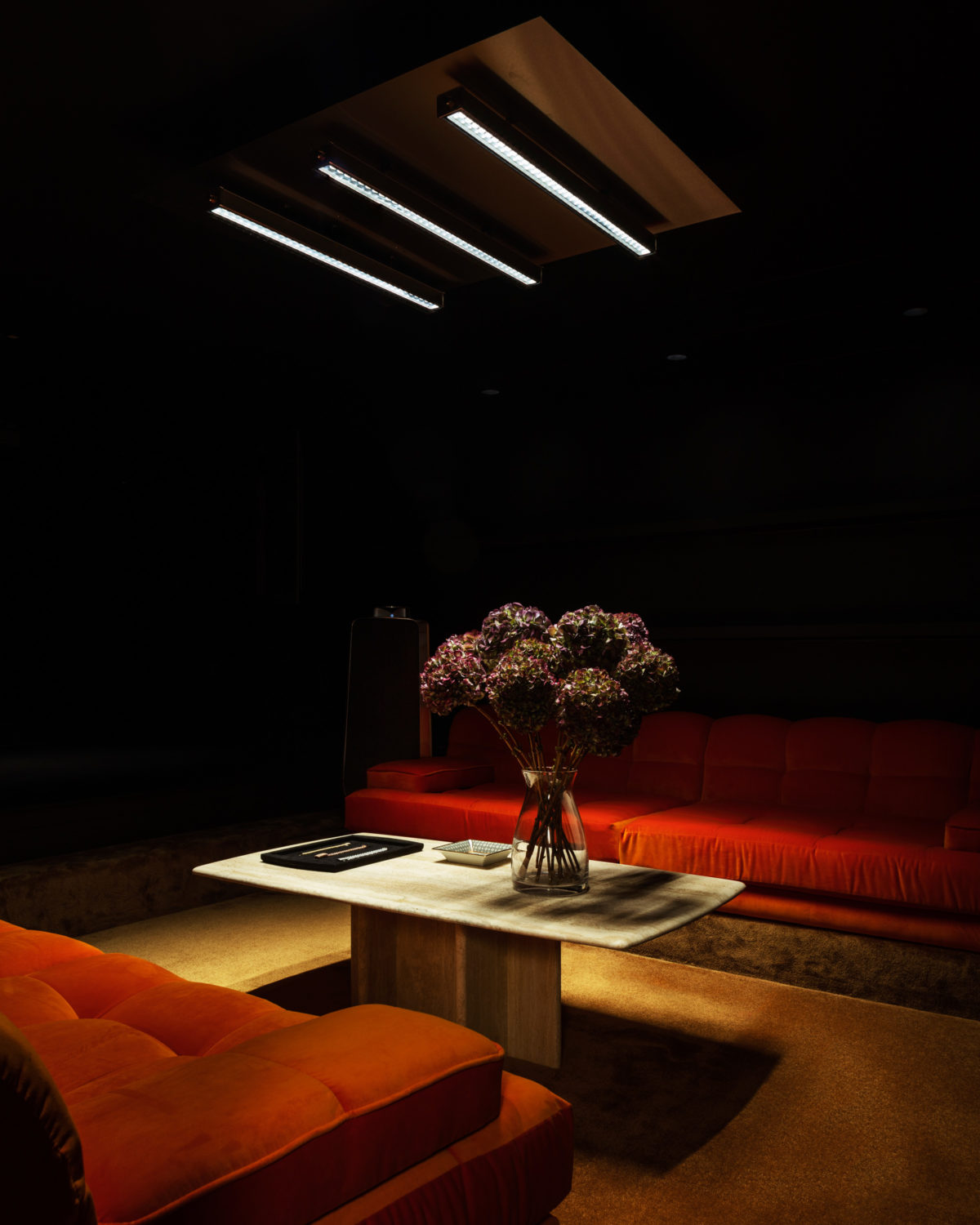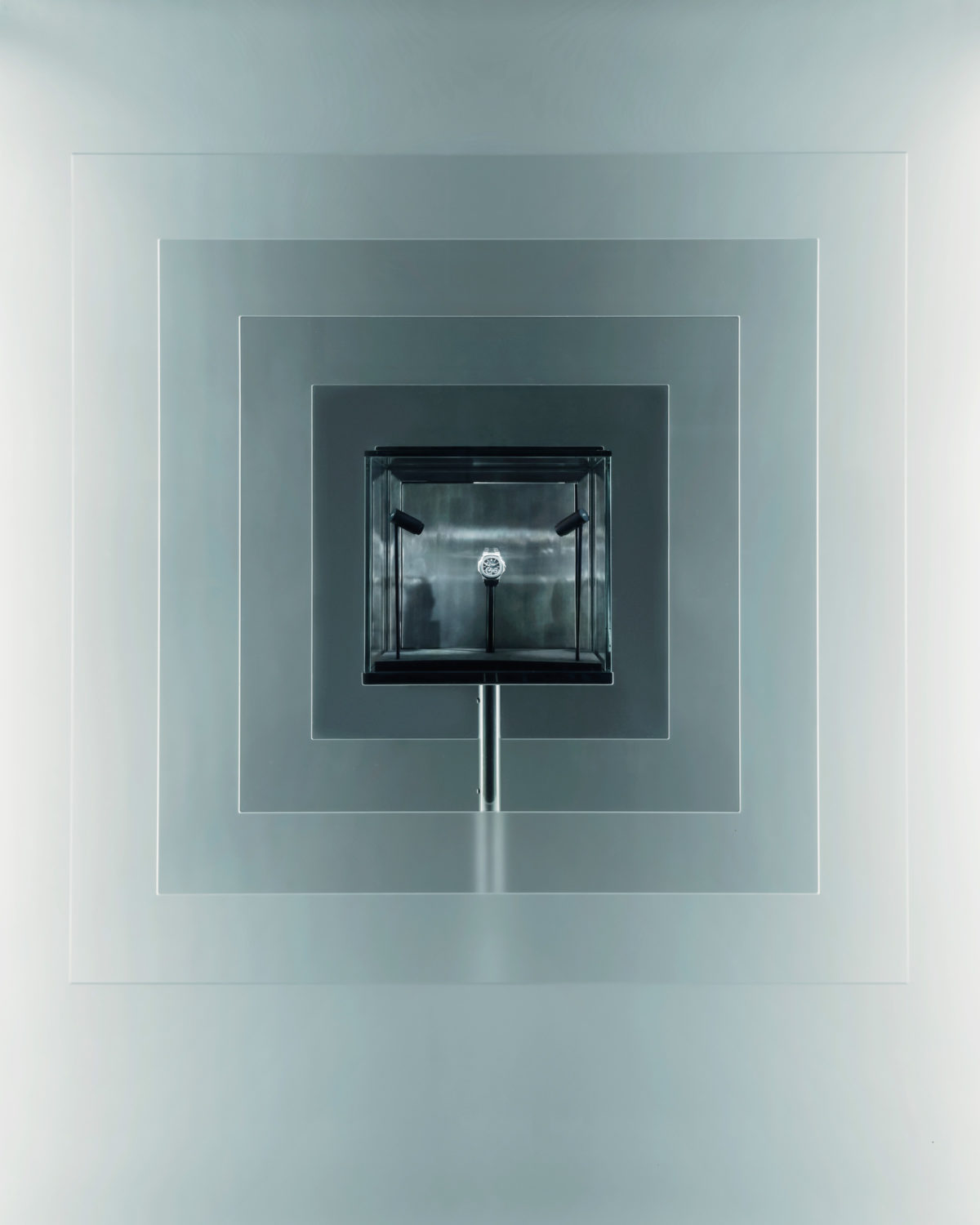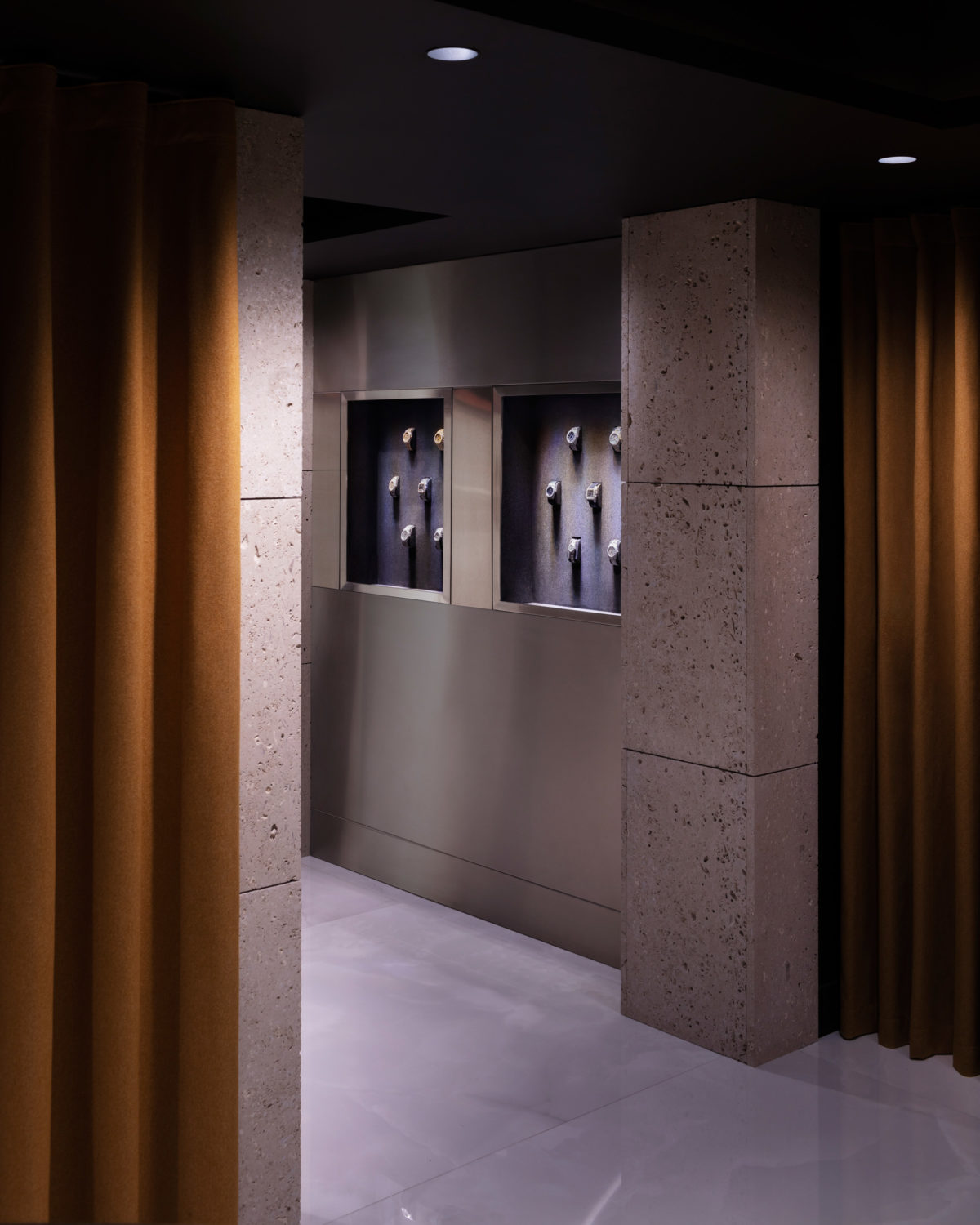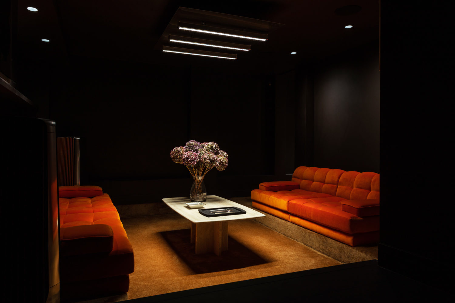In the Viewing Room, customers are greeted by the sales staff, surrounded by two massive, custom-made stainless steel display cabinets filled with watches and jewellery. This room is surrounded on all walls by camel wool curtains. Beyond the curtains is the Rear Room, a private sales room wrapped in soft fabric, where the most exclusive and rare watches are kept, and customers can sit down at massive stone table.The VIP lounge is located in the basement, featuring a conversation pit made with thick pile luxurious carpet and tangerine velvet upholstery, where customers can view the rarest watches and custom diamond pendants.