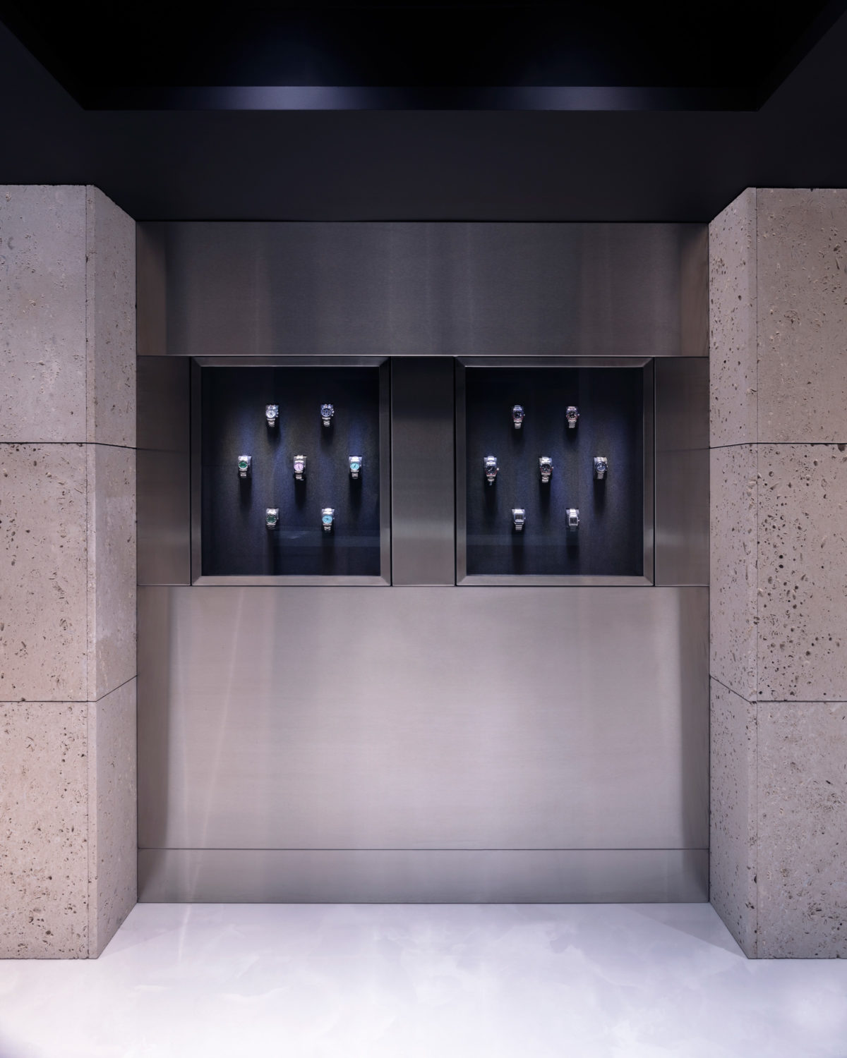 The flagship store demonstrates how the unique and fresh aesthetic of the spatial identity can reflect the clash of luxury and popular culture typical for the watch and jewellery universe. The store is also designed to create a sense of exclusivity and inclusivity at the same time. As customers move through the space, the materials gradually change from bright and hard to dark and soft, while the number of displayed watches and jewellery pieces increases from just a few selected items to an archive-like collection in the more private rooms.