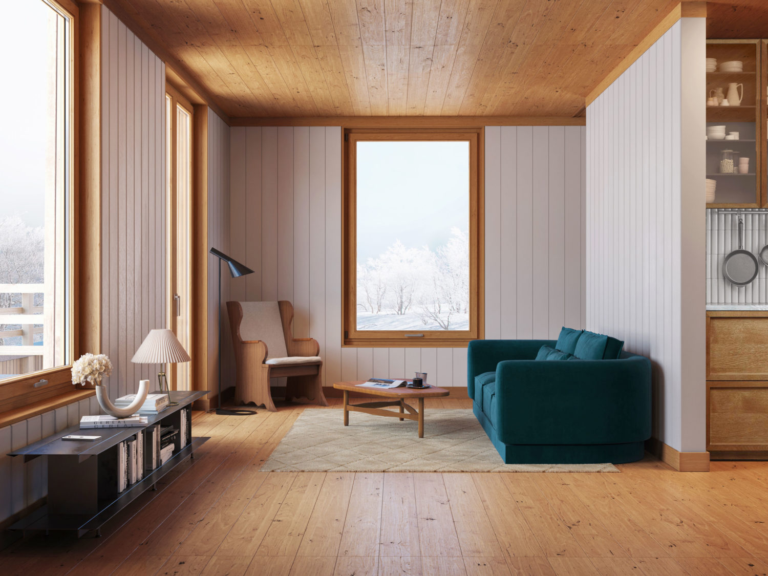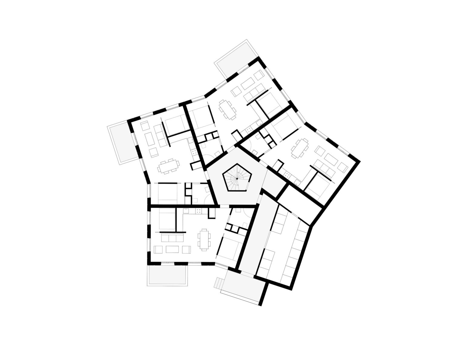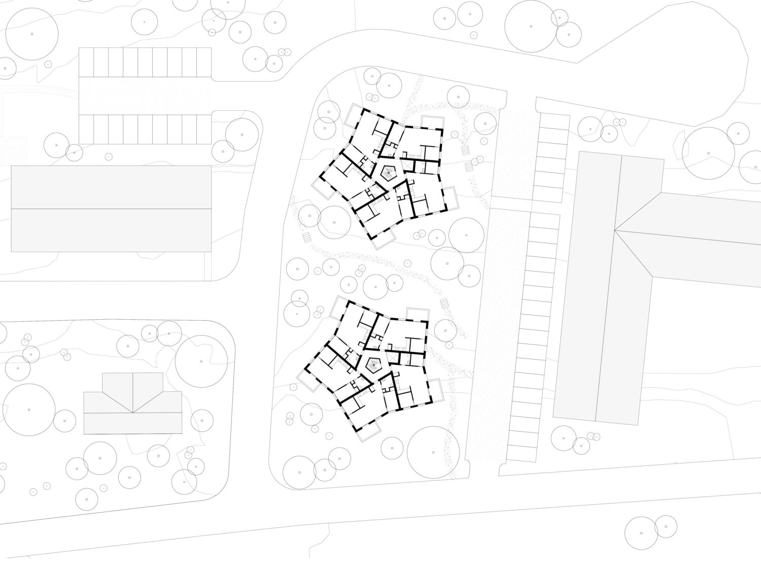 Pentagon Apartments consists of two four-storey buildings with a total of 40 units, forming the second phase of Hesselbrand’s master plan for Hemavan Ski Resort. The buildings sit closely together in a gentle slope of silver birch trees, framing the view of the expansive landscape. A unique pentagon shaped floor plan creates five bright corner apartments on each storey instead of four. The unusual plan also enables a spatial complexity otherwise impossible to achieve in a typical multi-storey dwelling.