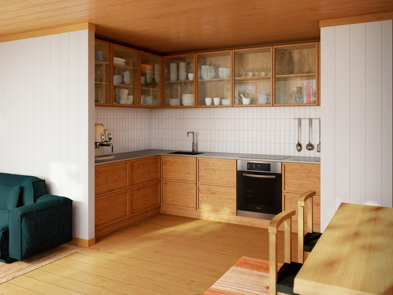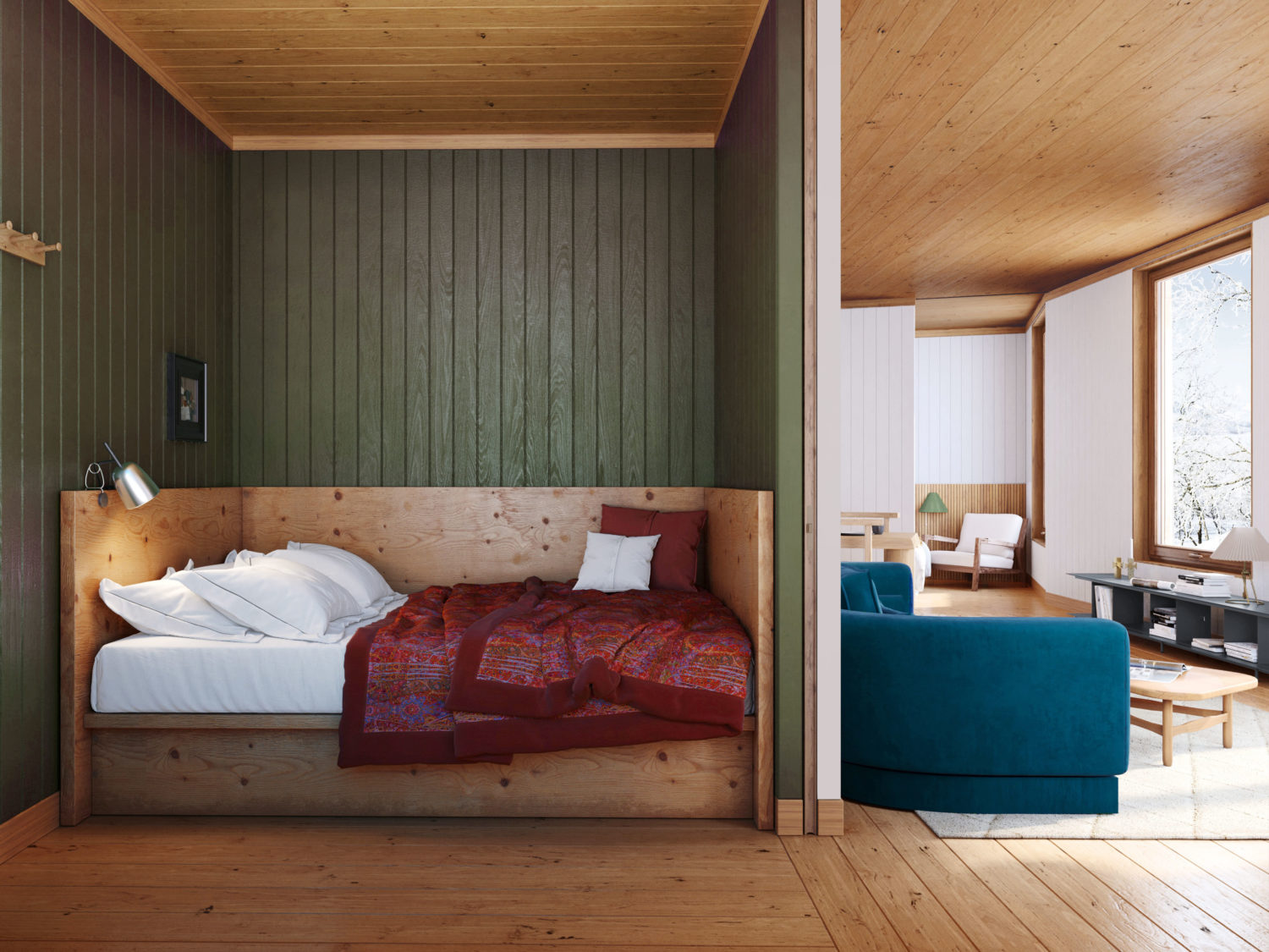 On the interior, the apartments consist of three rooms with a kitchen and living space in the centre. Services and circulation are concentrated to the inner part of the plan, pushing living spaces and bedrooms towards the façade. The result is an unobstructed interior space with large windows and balconies in the corners, overlooking the untouched surroundings. Meanwhile, the smaller rooms on either end of the plan can be used as additional living spaces or bedrooms thanks to their floor to ceiling sliding doors.