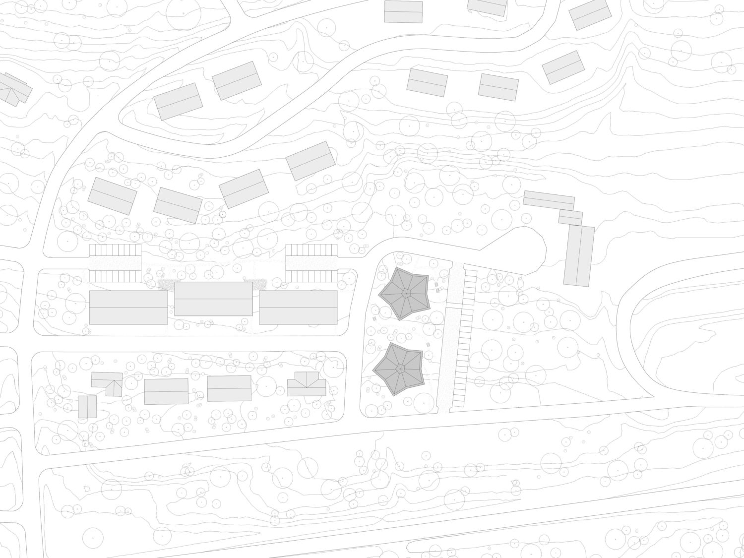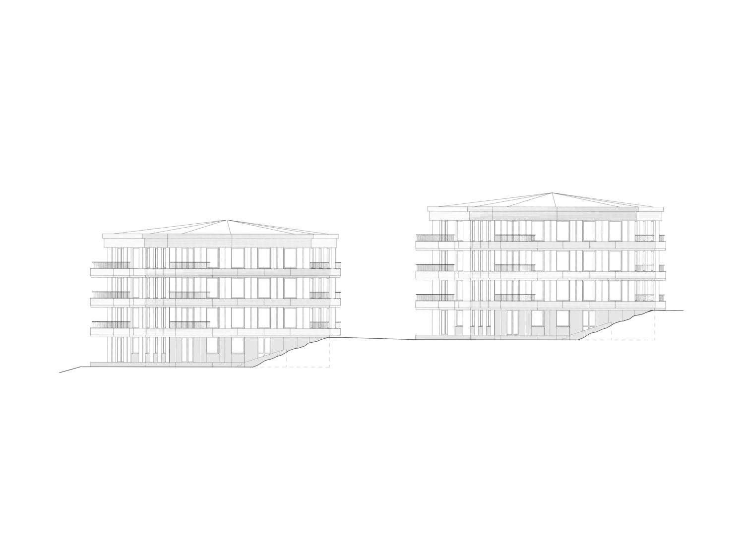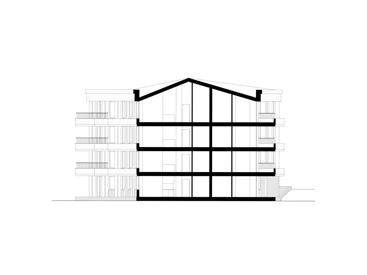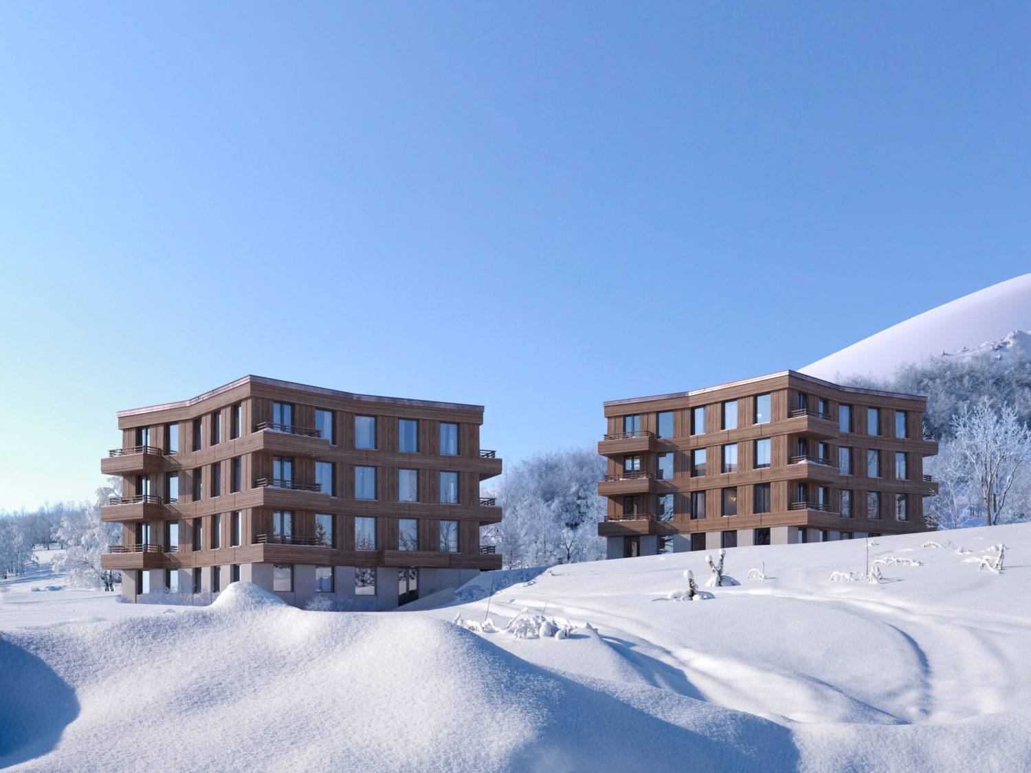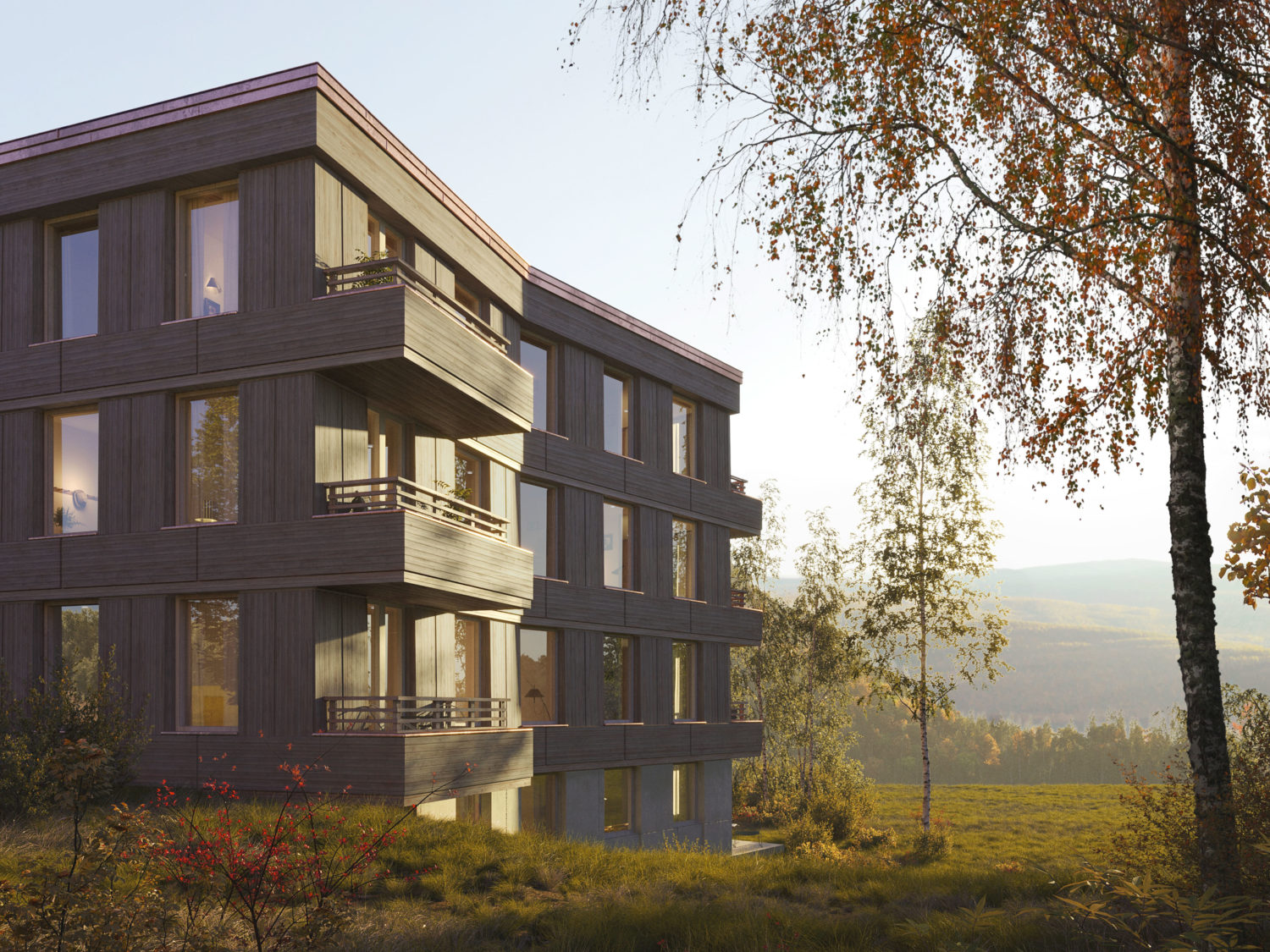 The two structures achieve a high density of units whilst creating an intimate exterior space between the buildings, similar to what is often found in traditional alpine villages. The buildings themselves are composed of a plinth in locally sourced granite, on which three storeys of apartments sit, clad in charred ore-pine. Charring the wood is a traditional facade treatment that unlike painting gives a naturally sustainable weather protection and requires little maintenance.