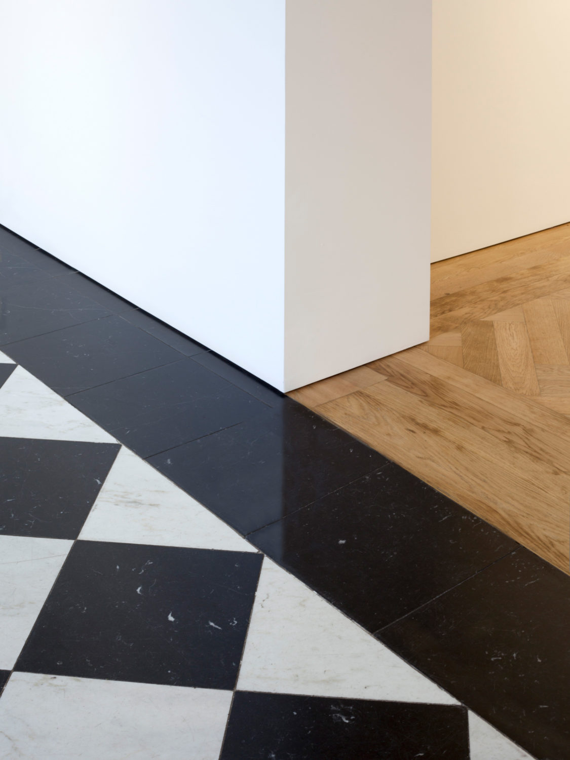 The interior of the gallery is designed as a sequence of spaces with slightly different character, with a symmetrical, skylit atrium as the focal point at the far end of the space. A checkerboard stone floor in the front space contrasts with a solid oak herringbone floor in the rest of the gallery.