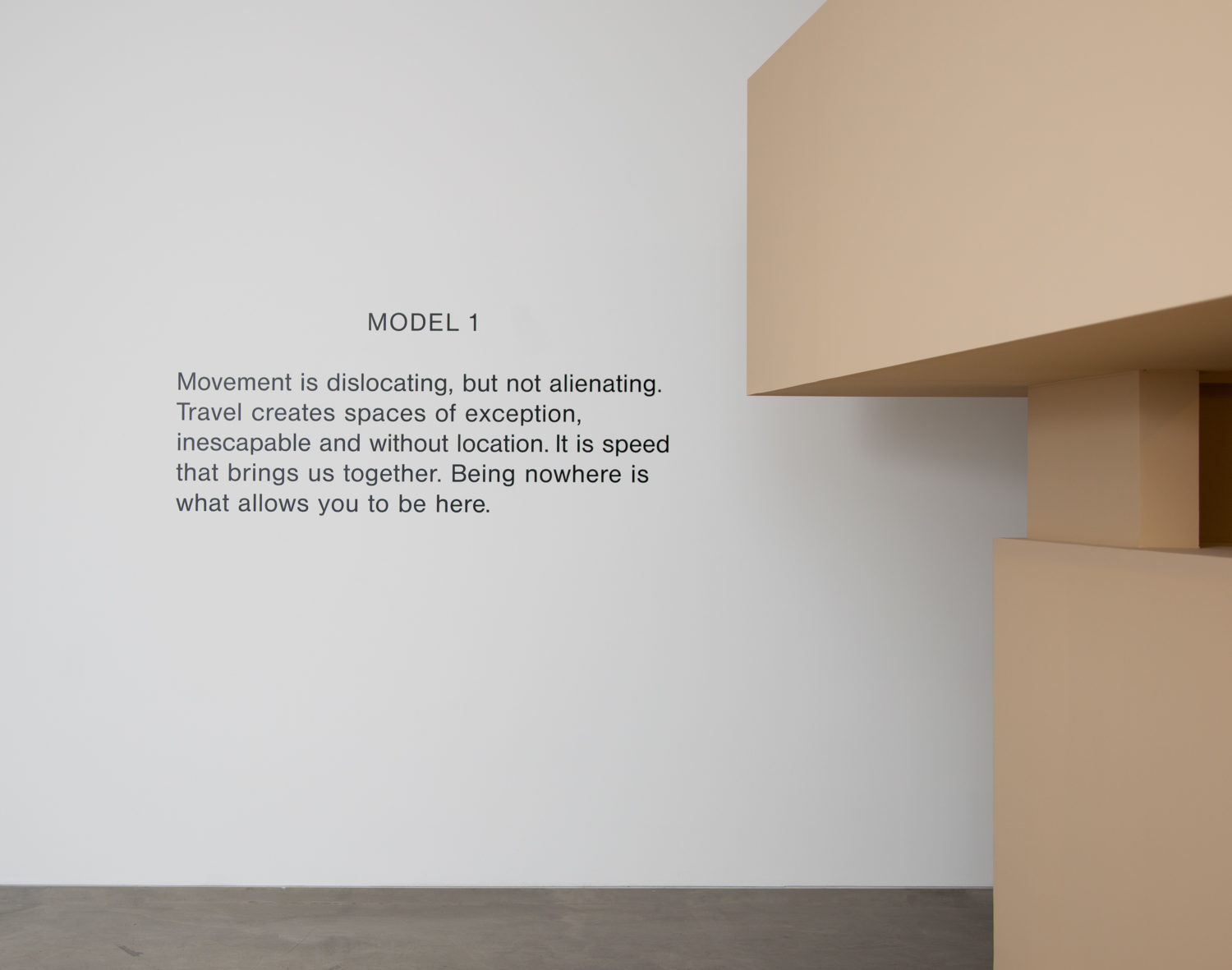 The objects were exhibited at the Soho Revue Gallery in London, where visitors could try the spaces that the objects produce around them. In Model 1, the spatial conditions of an object in movement in public space was replicated by creating a large protruding roof on top of a small intimate space. The shape of the roof pushes passers-by away from the internal space, creating a comfortable distance for the people inside the model. In Model 2, visitors can experience the essence of having a tall object to relate and orient to, in a large room with many people. It creates a gravitational point where people withdraw from the crowd, without ever leaving the space. In the third and last model, the spatial conditions of a beach are reproduced by creating a wide space with a slope, which can only be accessed from one side and which overlooks a horizon. This reproduces a space where people orient their bodies in the same way, and make contact through a collective act, but not necessarily by talking to each other.