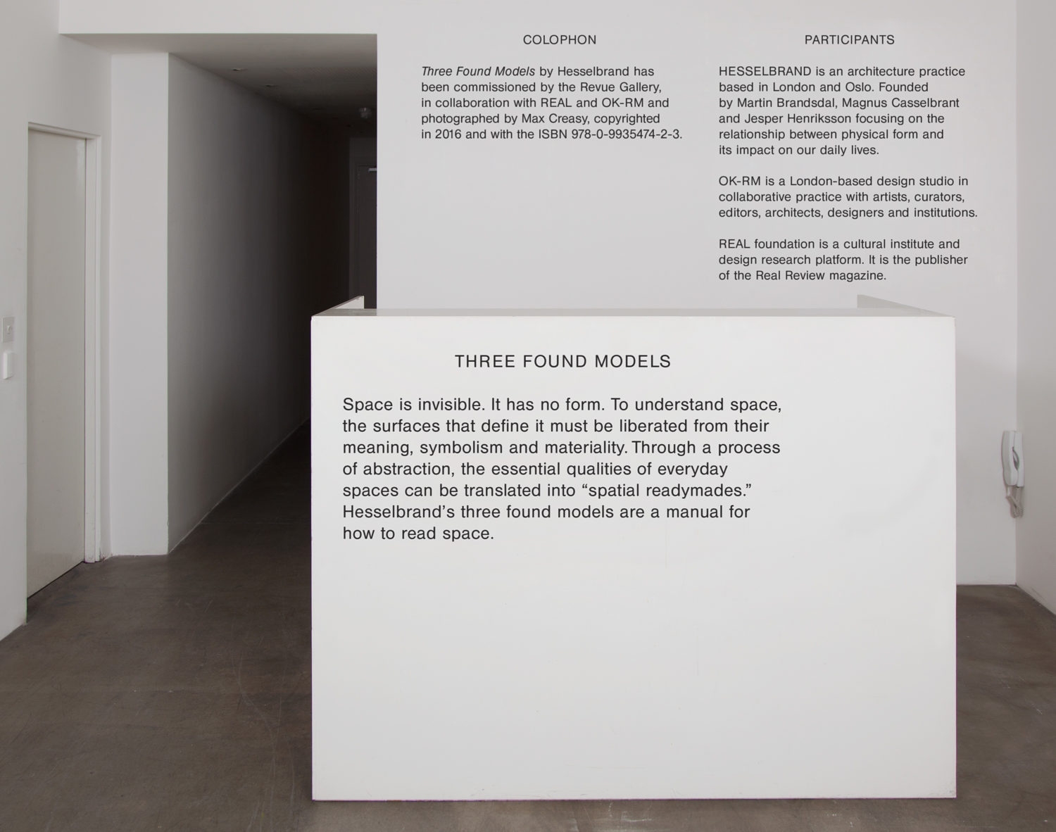 The project lives on after the exhibition as a tool for how to understand space. A photographic book with the same name was published in order to share the design methodology with the wider architecture community. The project is a manifestation of a process of abstraction, through which essential qualities of everyday spaces can be translated into “spatial ready-mades”, something that is central to the work of Hesselbrand.