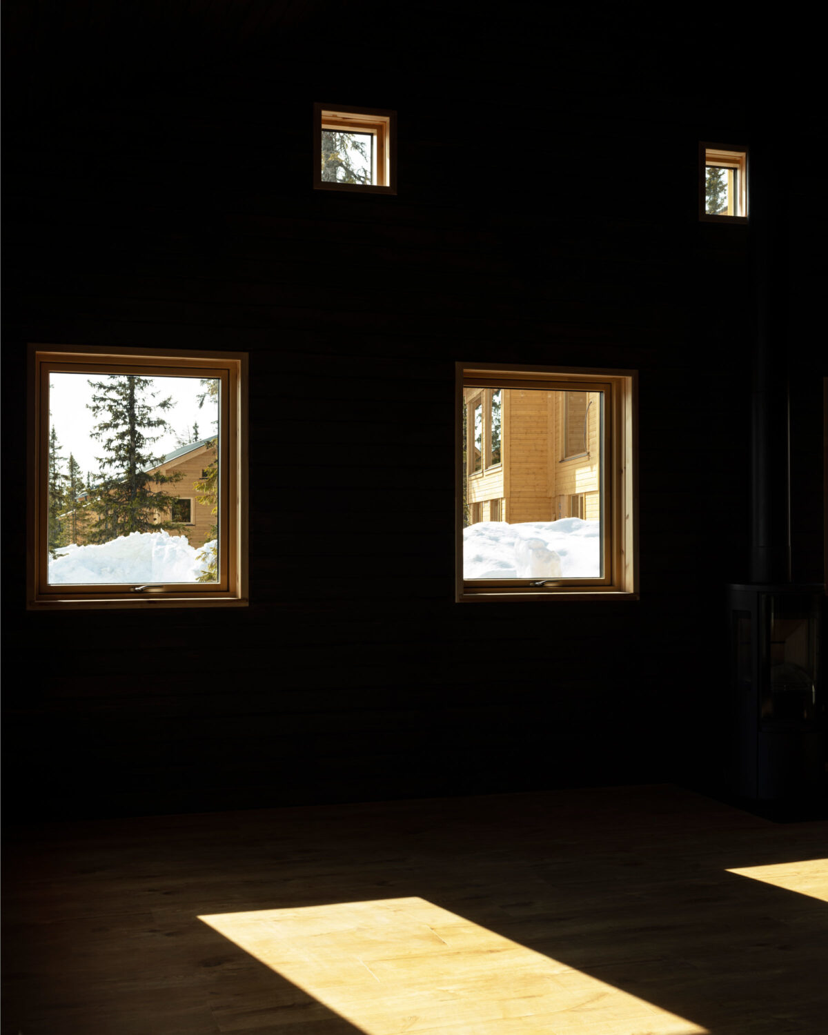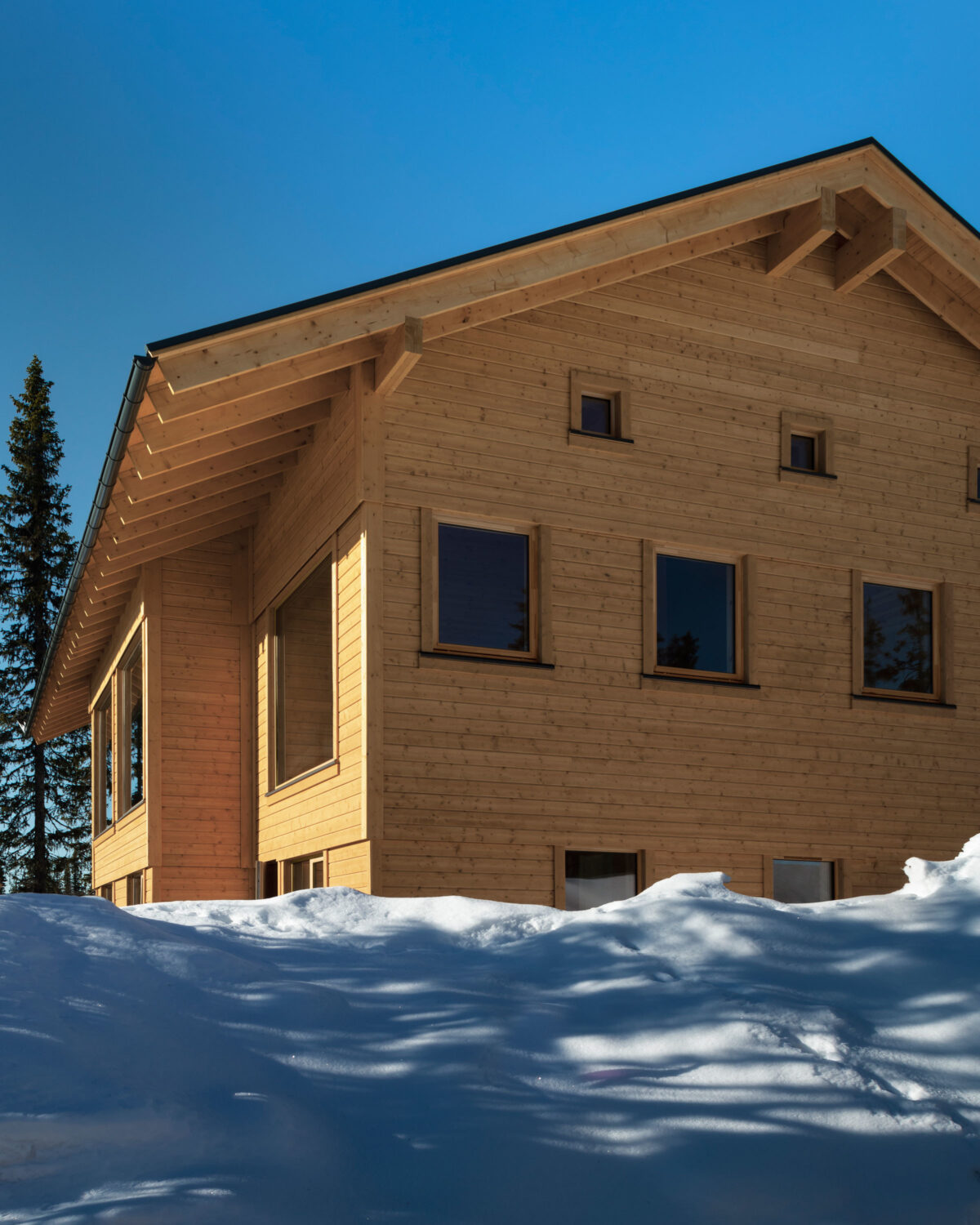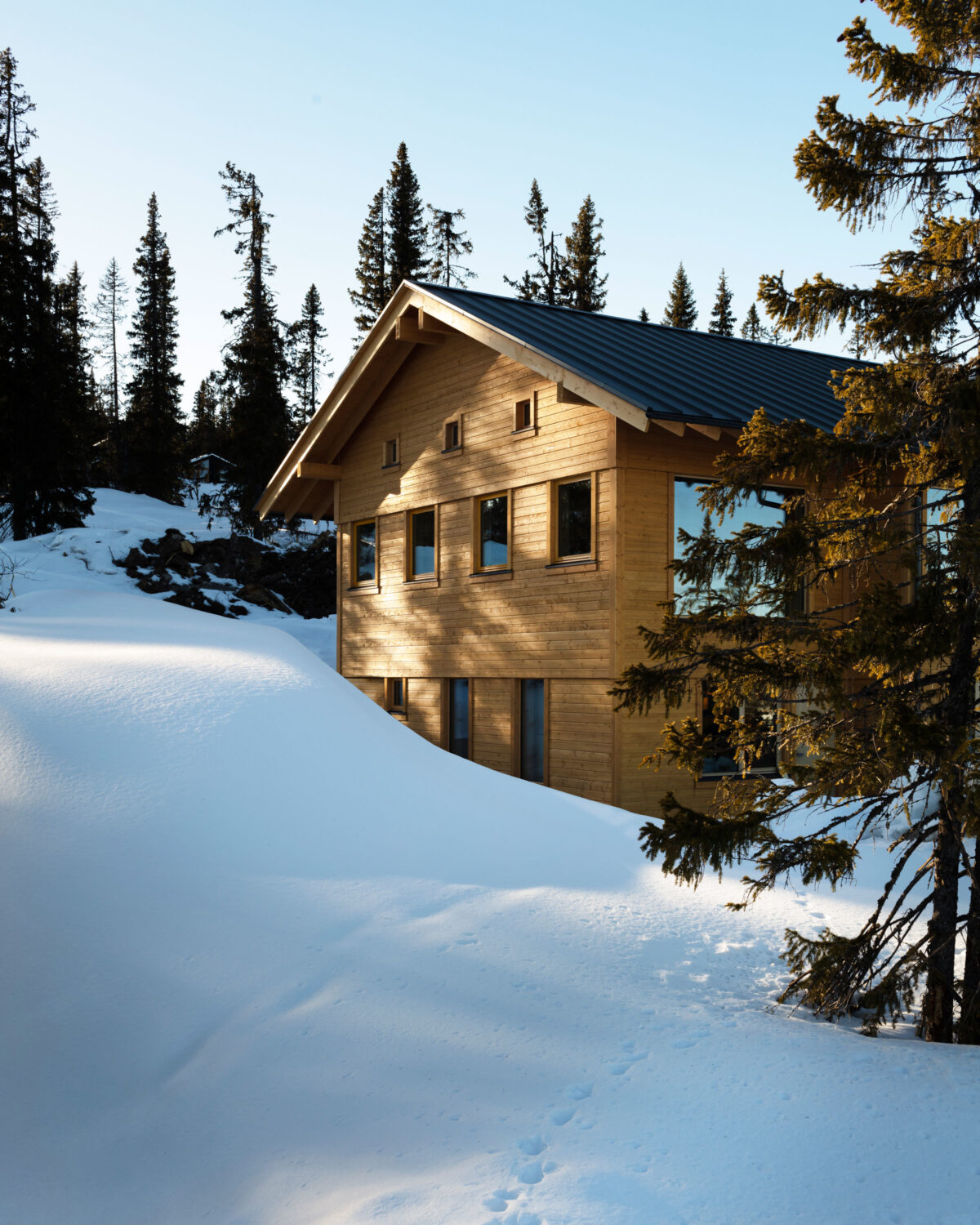 Each house is constructed by a prefabricated timber frame which is clad in a pine facade and covered by an overhanging metal roof. In the main façade, large windows overlook the valley and form a symmetry that seeks to unify the two houses to read as one singular building.