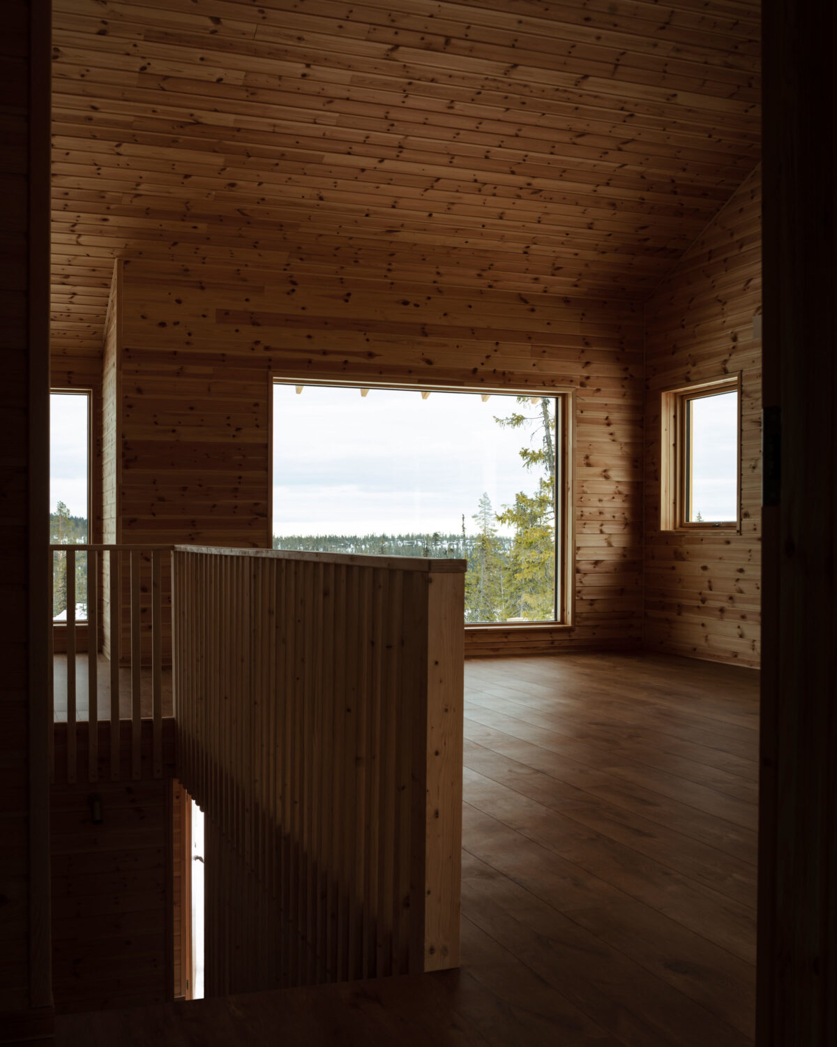 The plan of the main house consists of two levels and has been designed to give each room its own quality. The private spaces are spread out in the plan to maximise privacy while the shared spaces are set in the centre to encourage as many social overlaps as possible. To connect the building's experience on the inside to its appearance on the outside the timber panels of the facade extend into the interior’s walls and ceiling.